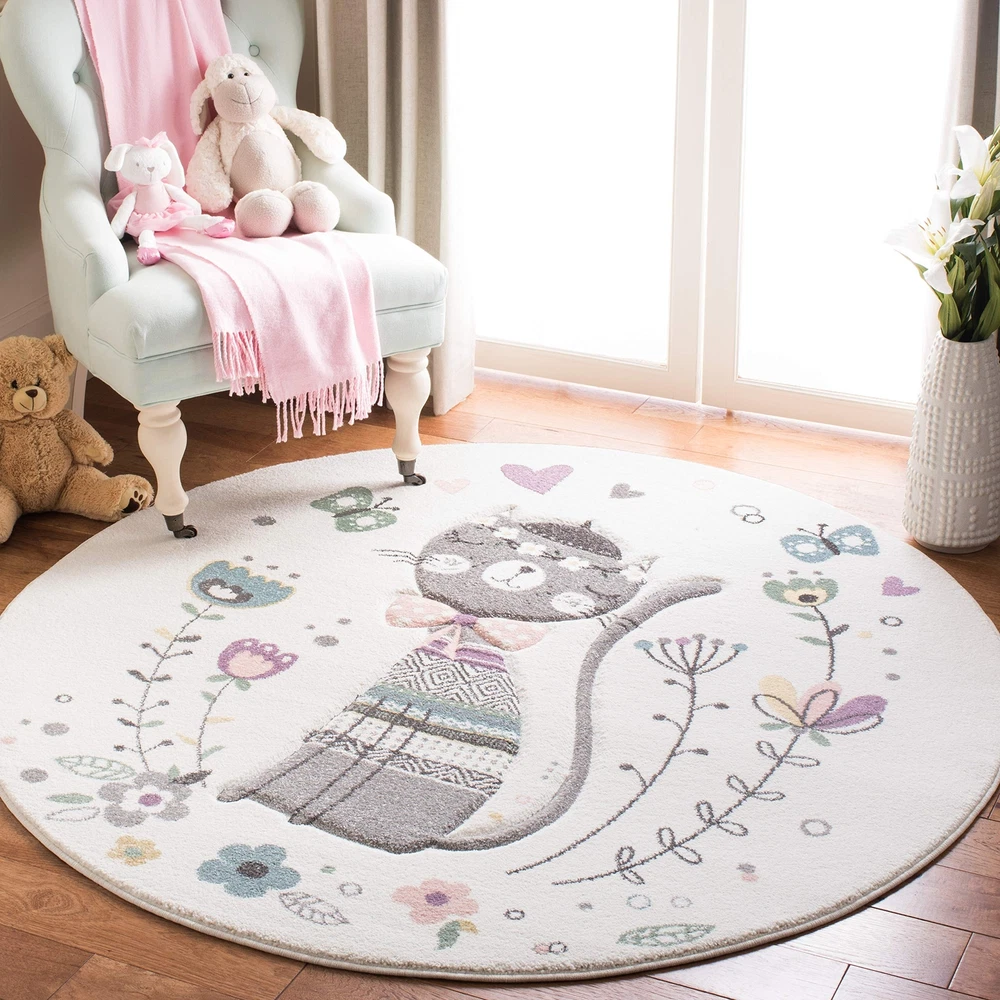 Carousel Collection 4' Round Ivory/Pink CRK187A Parisian Floral Cat Non-Shedd...