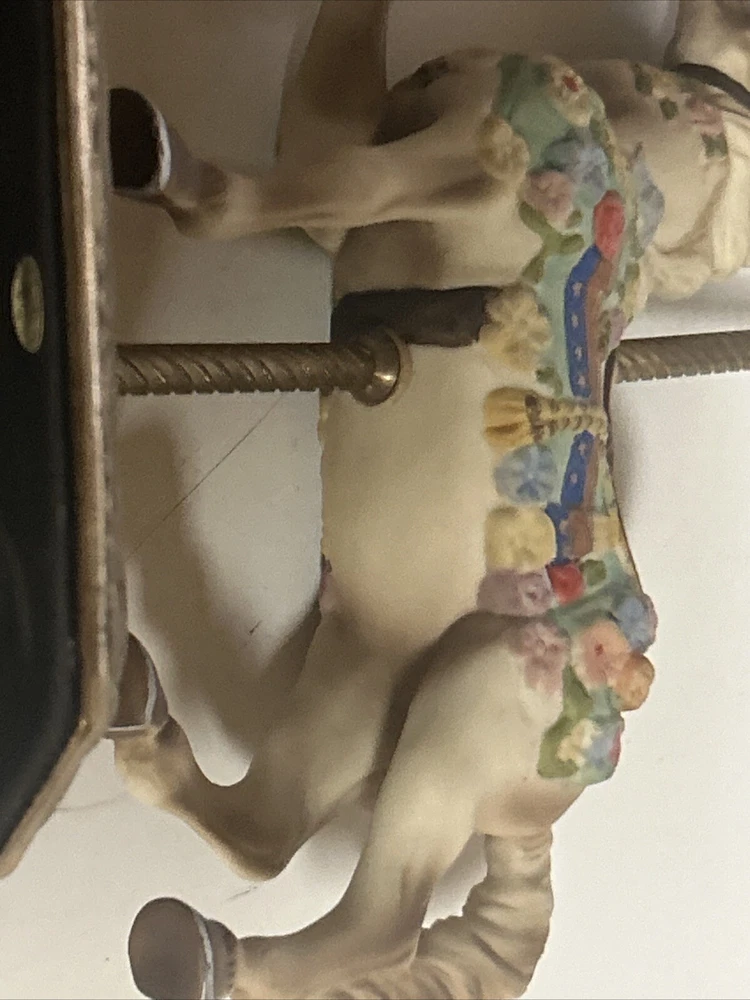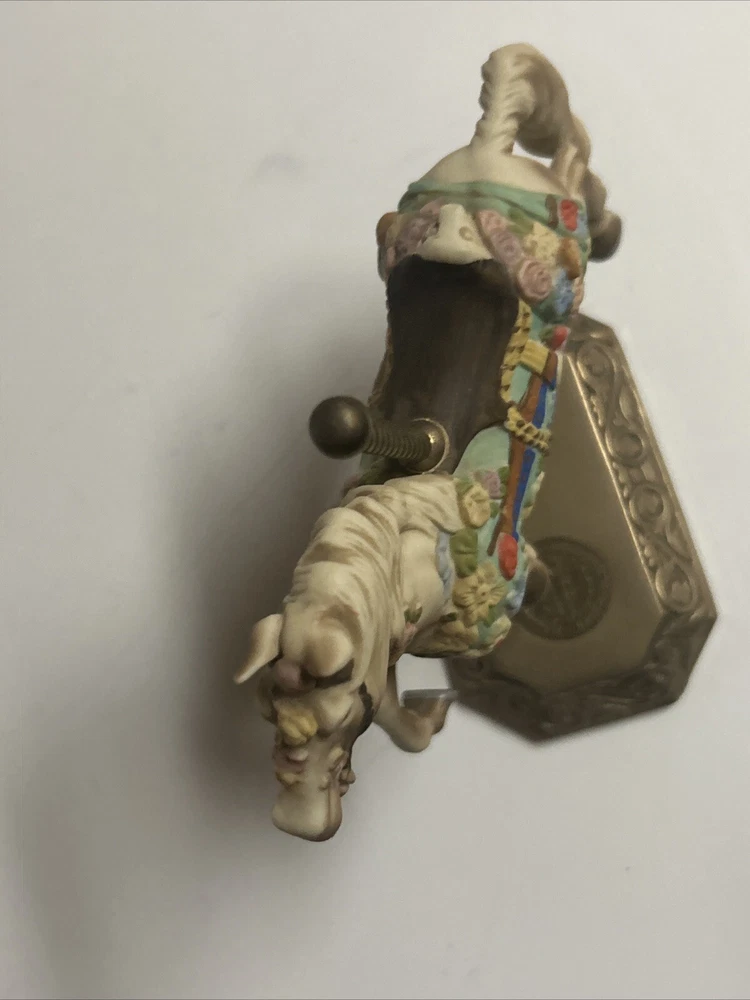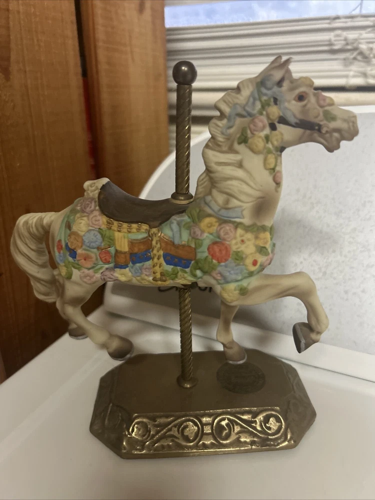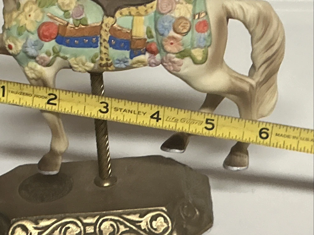 This limited edition Carousel Memories Americana Collection figurine by Willitts features a beautiful horse design. Crafted from porcelain and brass, this medium-sized figurine measures 7.5 inches in height and 6 inches in width, making it perfect for display in any room. The matte finish adds to its charm, and the multicolor horse pattern is sure to delight anyone who loves horses or cottagecore style. Signed by the artist, this figurine is a unique addition to any collection. Whether you're a fan of carnivals, circuses, or just love horses, this figurine is a great reminder of childhood memories and the joy of life. Excellent condition