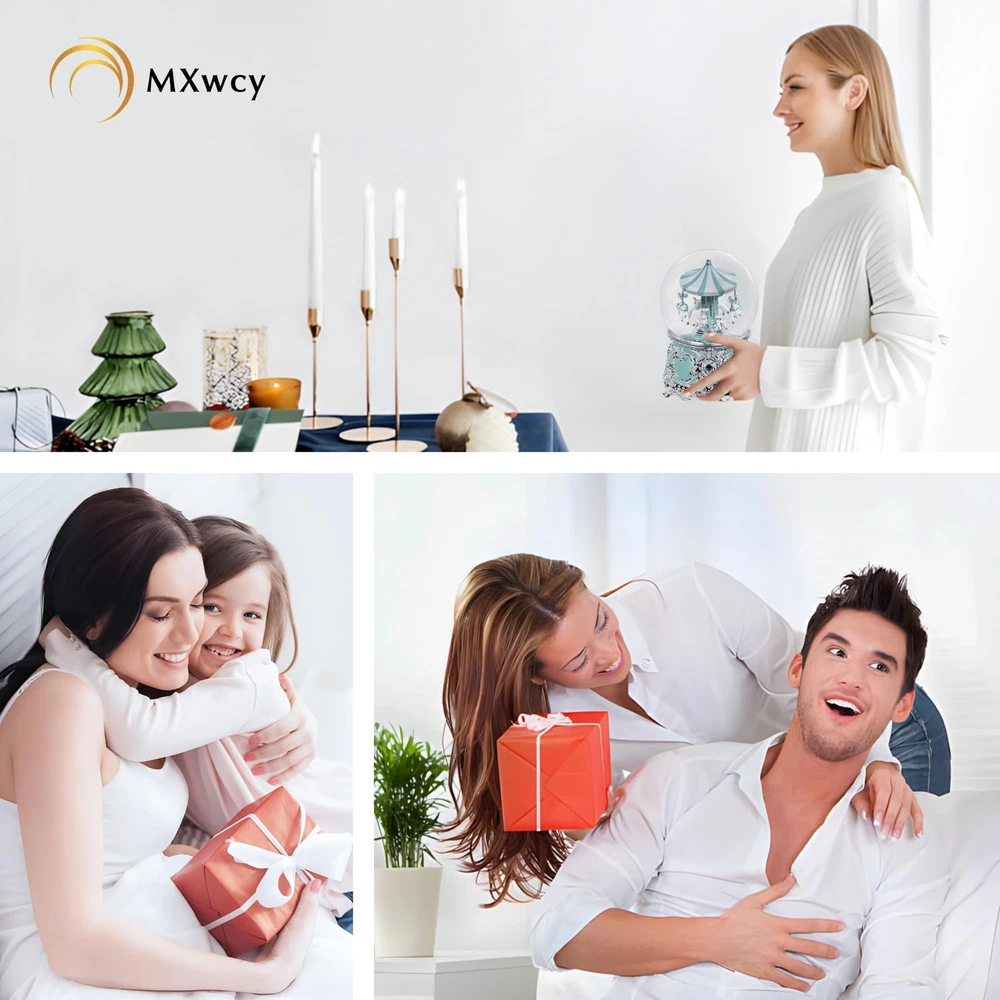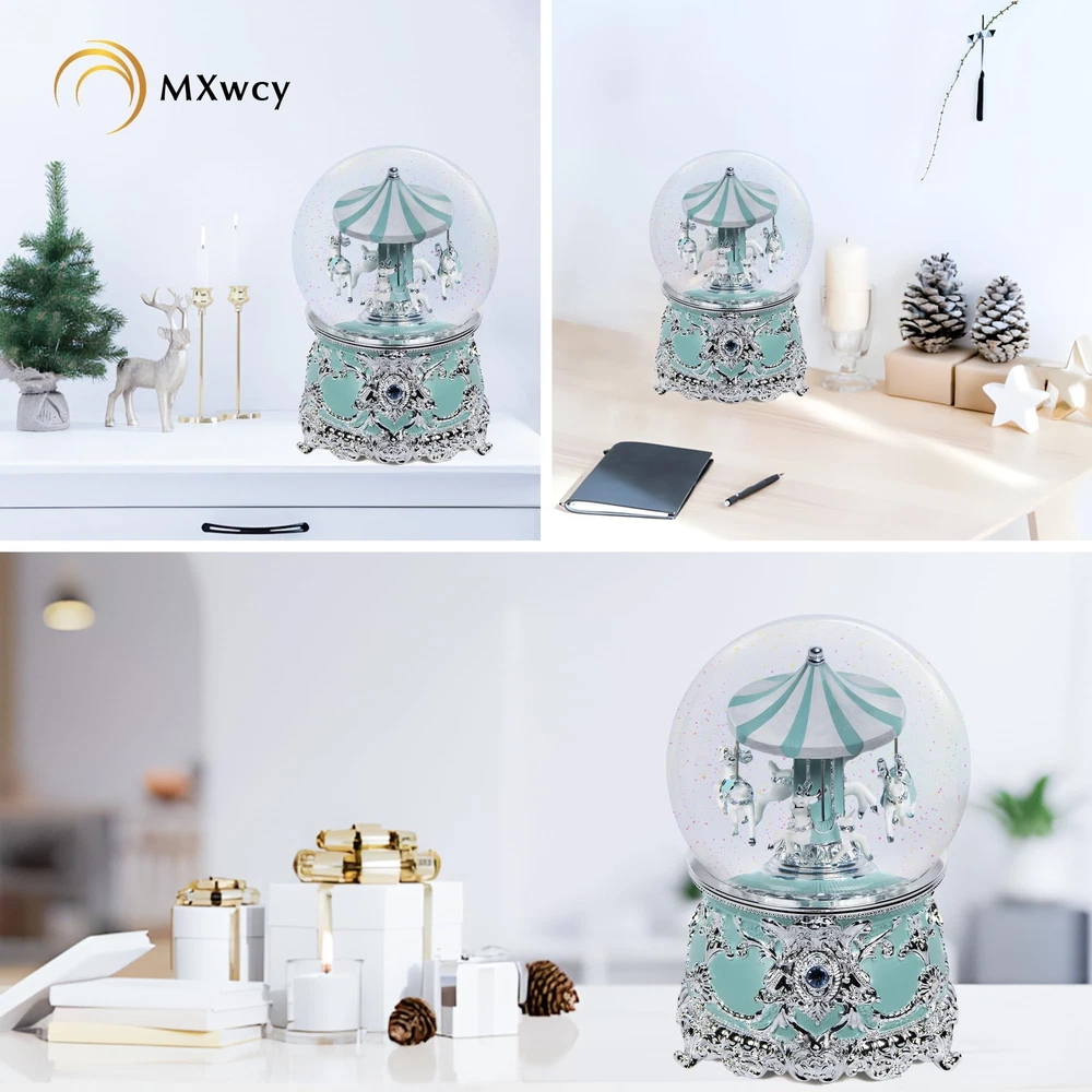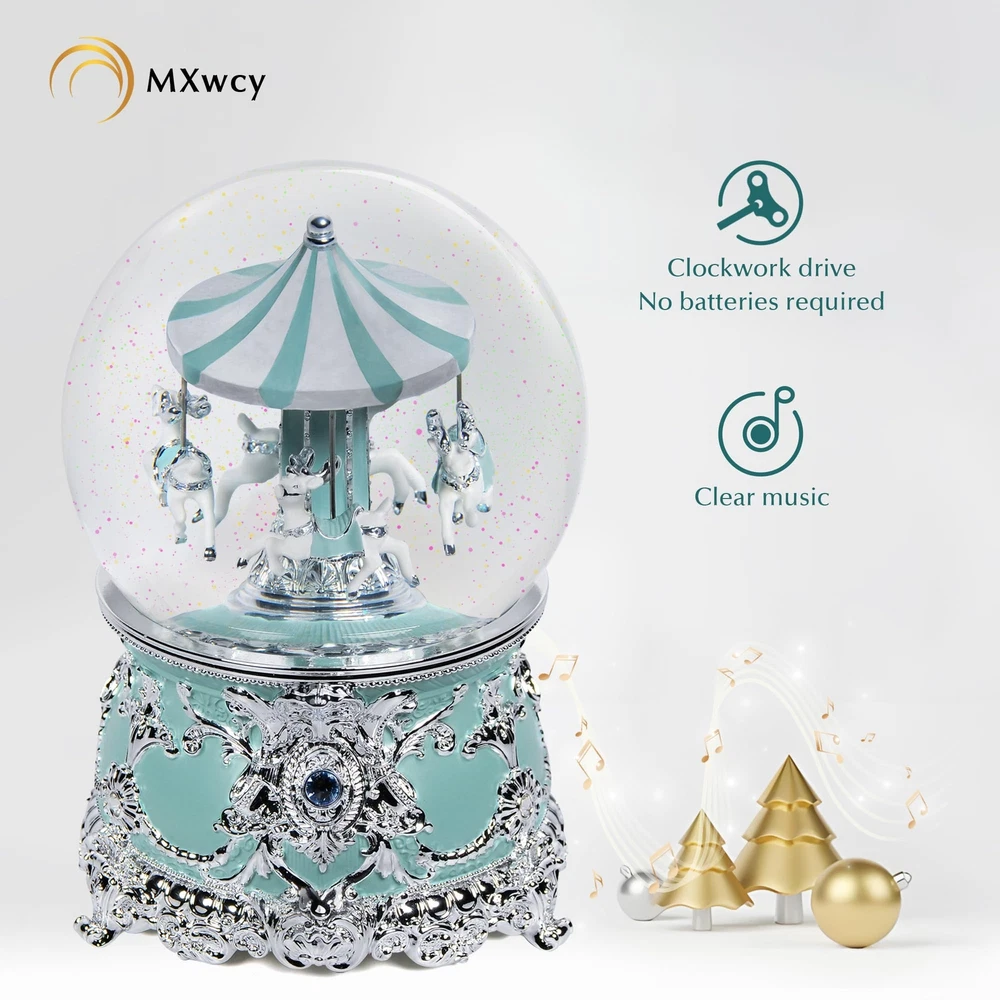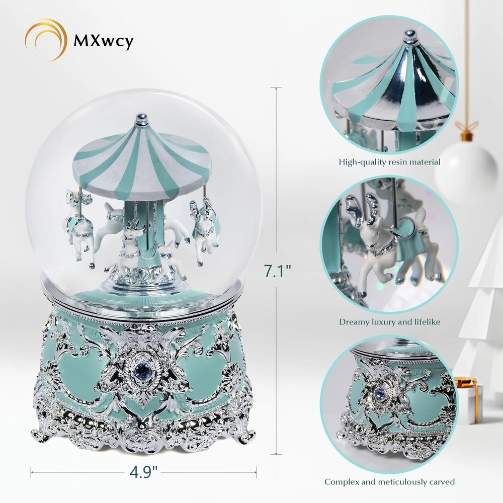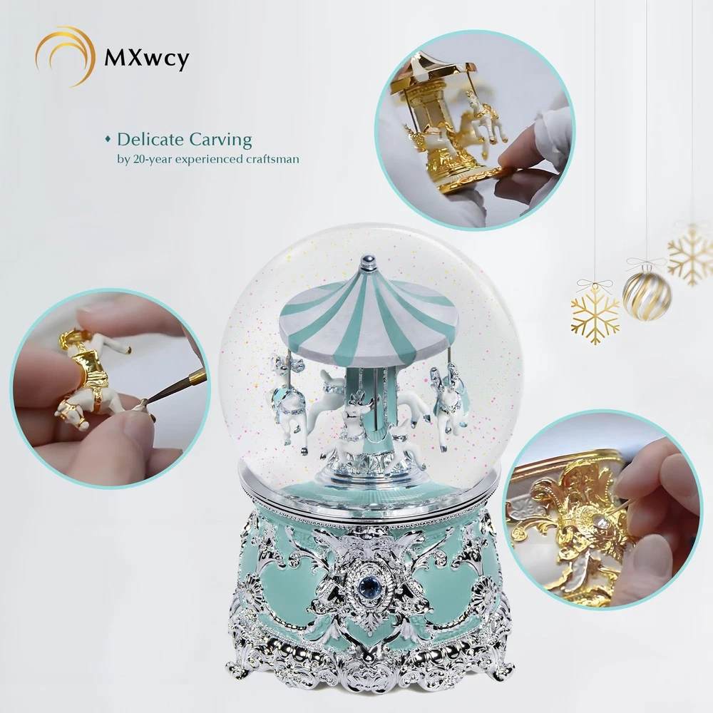 Size & Material: Made of high-quality resin for the base, with dimensions measured at 4.9 x 4.9 x 7.1 inches. This charming christmas snow globes is handmade and delicately crafted, with carousel. Mechanical Music Box: This beautiful snow globes features a unique design. No batteries are required. A soothing and peaceful melody will play, will flow after gently rotating the clockwork 2-3 times to the right. NOTE: Rotate winder clockwiseno more than 3 full cycle. When the music box fails to play music, you can gently turn the spring counterclockwise. NOTE: If the sequins are stuck to the frame, please turn on the snowball lamp and leave it for two days, the sequins will fall off automatically. Exquisite Carving: This charming carousel music box is vivid, 4 moose moving different side, even on the horses along with detailed saddles and reins. Beautifully detailed carving around the body of the music box,make it a stunning centerpiece. Gift Decor: A beautiful music box that adds a charming touch to your holiday home décor. The carousel horses music box makes a wonderful gift for a wife, girlfriend, mom, kids, and friends for all kinds of occasions, including Thanksgiving, New Year, and the Christmas holiday season. Risk Free Shopping: We are committed to providing all customers with high-quality and affordable decorative products. If you have any questions, please feel free to reach out to us. Our professional customer service team will get back to you as quickly as possible.