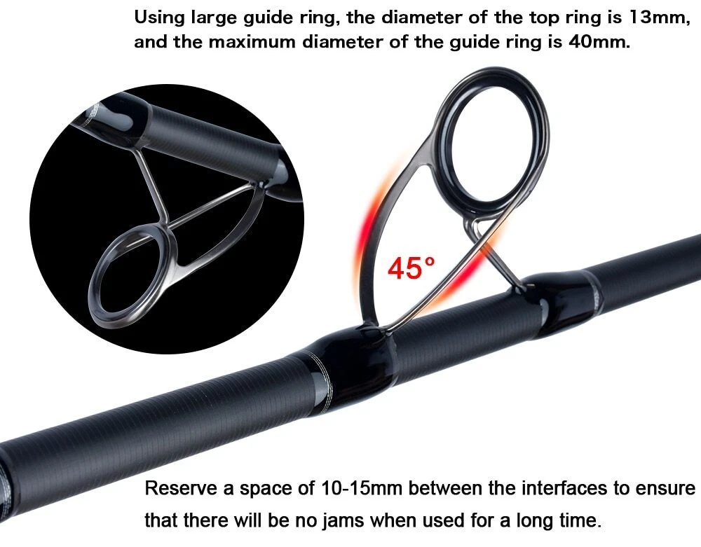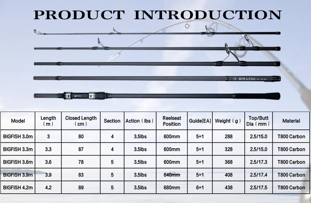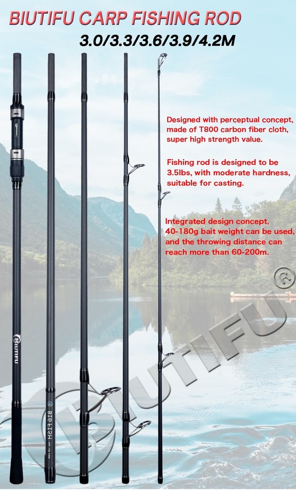 BIUTIFU Carp Fishing Rod 3.0/3.3/3.6/3.9/4.2m 1.Designed with perceptual concept, made of T800 carbon fiber cloth, super high strength value; 2.Fishing rod is designed to be 3.5lbs, with moderate hardness, suitable for casting; 3.Integrated design concept, 40-200g bait weight can be used, and the throwing distance can reach more than 60-200m; 4.Special parts are made of 1K carbon cloth, which is durable and beautiful, and the inner section is made of high-strength matte tape; 5.The 45°"KW" guide ring in matt gun color is adopted, which has high strength, anti-oxidation, and is easy to cast; 6.Using large guide ring, the diameter of the top ring is 13mm, and the maximum diameter of the guide ring is 40mm; 7.Use "I" type hook; 8.High-quality nylon material reel seat, lengthened nut, more comfortable grip; 9.Black shrink film non-slip grip, 10.High-strength aluminum tailpiece, impact-resistant and wear-resistant. Use PVC pipe or thickened bubble column + thickened carton for transportation to ensure safe transportation. You may also like