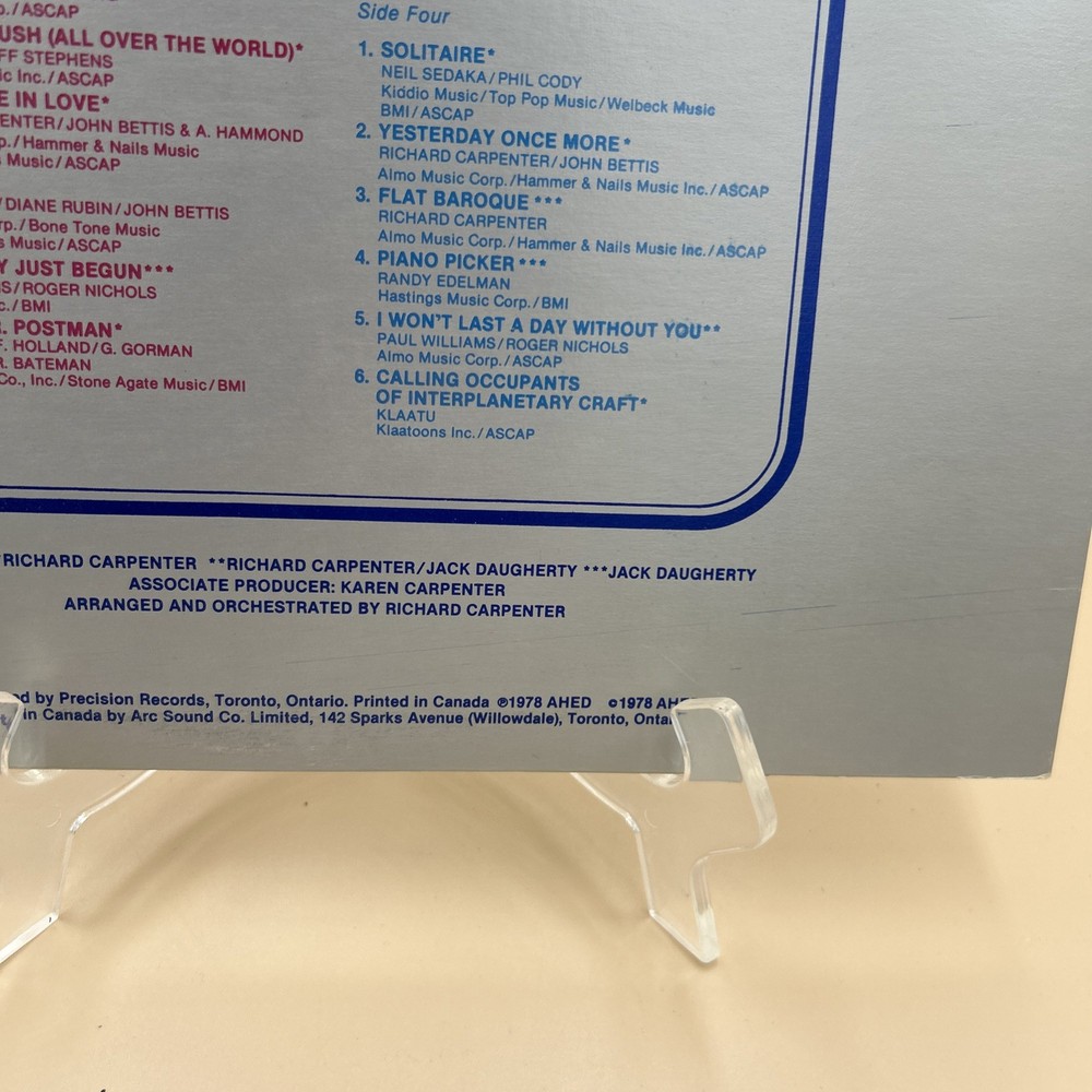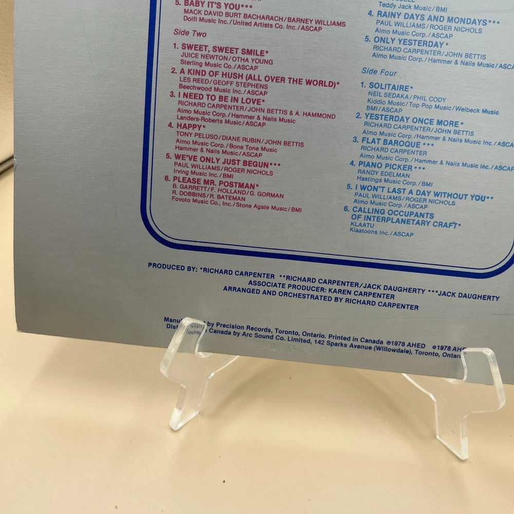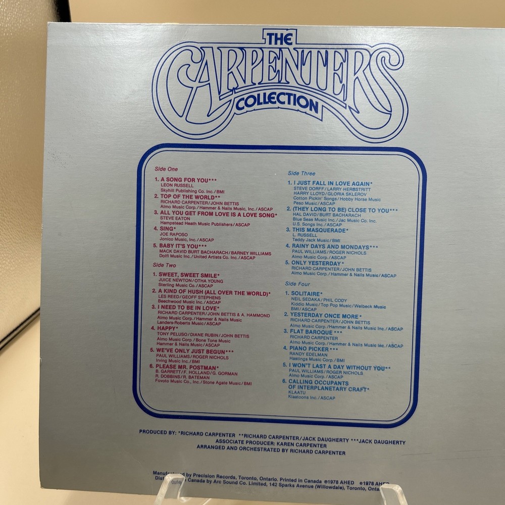 The Carpenters Collection is a double LP vinyl record released in 1978 by AHD Records. The album features popular pop and rock songs by the Carpenters, with the record grading and sleeve grading both marked as Very Good Plus (VG+). This collection comes in a cardboard sleeve and includes the original cover art, making it a valuable addition to any music lover's vinyl record collection. The album is in English language and originates from Canada, offering a nostalgic trip back to the 1970s era with its classic tunes and iconic duo, The Carpenters.