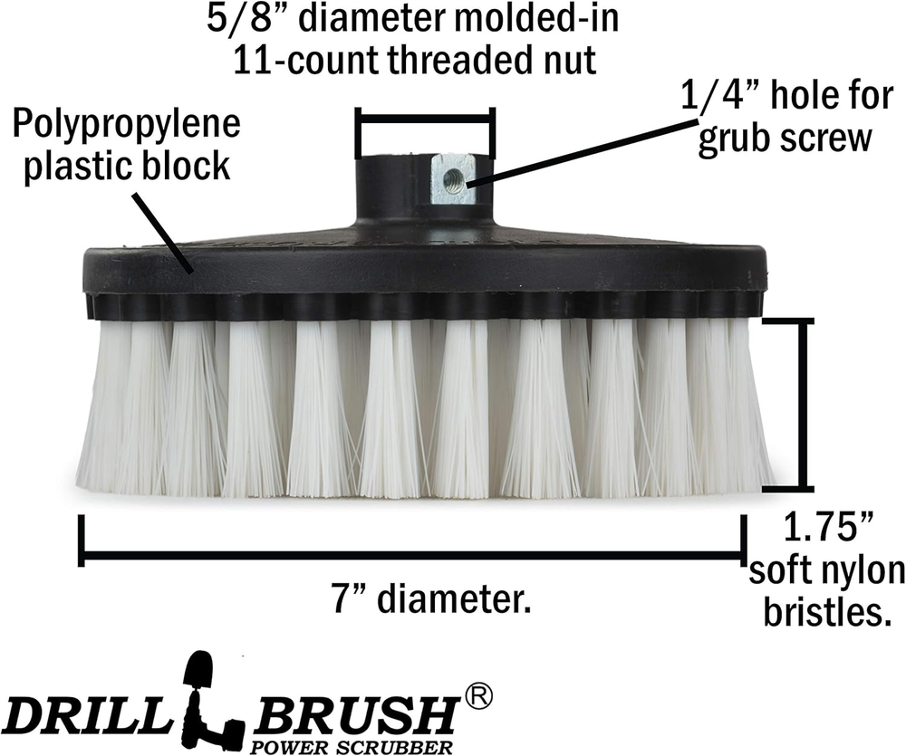 Carpet Cleaner Scrub Brush for Polisher - 7 Inch Soft White with 5/8 X 11 Threaded Hub for Rotary Polisher Machine - Large Car Buffer Brush - Large Carpet Scrubber - Drill Adapter Included Professional Grade 7 inch diameter soft white rotary scrub brush, carpet cleaning brush. The 7-inch diameter is great for large area floor cleaning, seat cleaning, upholstery cleaning, and general-purpose interior cleaning and detailing. Save both time and effort with this new upholstery cleaner drill brush. After one use we know that this car carpet cleaner kit will be your new favorite car interior cleaner. This offer features our most popular car detailing brush. This product is also great for large cleaning areas like furniture and carpet. The large area of the brush allows the user to make quick work of dirty carpets and furniture. It can also be used to clean floor mats, and rugs. For use with variable speed and dual action polishers. This product also includes a 5/8 x 11 to quarter inch quick-change heat-treated adapter so you can also use it in your cordless drill or impact driver. Cleaning task big or small Drillbrush has got a brush for them all. Brush features 5/8 x 11 Threaded Hub (not for use with grinders) Our large diameter cleaning brushes will fit on most car polishers, car buffers, polishing machines, buffing machines, and rotary polishers. It also includes a set screw to keep the brush secure. Introducing the 7-inch flat soft white. This brushes unique bristle cut making this the ideal car wash kit, car seat cleaner kit, car window cleaning brush for home use, and tire cleaner kit. Our most popular use for the 7-inch is as a Large area carpet brush for cars, trucks, and boats. Use with variable speed and dual action polishers. This product also includes a 5/8 x 11 to quarter inch quick-change heat-treated adapter so you can also use it in your cordless drill or impact driver. This soft stiffness auto detailing brush is recommended to be used as car detailing supplies for almost all surface of your vehicle. You can use this brush as a car detailing brush, tire cleaning brush. Our products feature a rugged 5/8 x 11 to quarter inch quick-change heat-treated adapter. Superior Support and Durability: All Drillbrush Products have a 90 day no questions asked return window. If you are not completely satisfied with our product, we will issue a refund or ship out a replacement at the buyer's request. Cordless Drill NOT included. Product Description Clean Faster Combine the spinning motion of your power drill with any of our brushes and start cleaning with speed and power used by professional cleaners everywhere. Clean Easier Drillbrush strives to make cleaning easier and more fun than ever before. We want to make cleaning less of a chore and give you more time to spend doing the things you love. Clean Better Drillbrush works hard to make sure you always have the right tool for the job. We are constantly listening to feedback and creating new products where we think we can help consumers start cleaning easier. Clean Anything Join the millions of happy Drillbrush customers and get that car, bathroom, kitchen, boat, garage, or grill looking brand new. Whatever the application may be Drillbrush has a cleaning kit for you. Item model number 7in-L-W-T-DB Unit Count 1.0 Count Number of Items 1 Color White Special Feature Reusable Product Dimensions 7 x 7 x 4 inches Material Nylon Handle Material Wood Item Firmness Description Soft Item Weight 15 ounces Shape Round Specific Uses For Product Carpet, Floor, Furniture, Wheel Surface Recommendation Carpet, Floor, Furniture, Wheel Global Trade Identification Number 00600977400461 Included Components Attachment Is Discontinued By Manufacturer No 7.0 inches x 7.0 inches x 4.0 inches. Weight: 15.0 oz Shipping from the USA All of our products are shipped from the USA, ensuring quick delivery to your destination. Payment We offer the following payment methods: PayPal, credit card, bank transfer, and eBay's secure payment system. Free Shipping & Free Returns Shipping within the USA is FREE. Additionally, any return is absolutely free for you. Risk-Free Purchase You have the option to return an item within 30 days without any justification. We cover the return shipping costs! Fast Shipping We ship immediately upon receipt of payment. Generally, the package is delivered within 2-3 days in the USA. If it takes longer, we will contact you. Quality and Costs Made in Europe, USA, China No customs fees or additional charges Total satisfaction guarantee Invoice with declared VAT available upon request in .pdf format Feedback Your feedback is very important to us. After you pay for your purchase, you will automatically receive positive feedback from us.