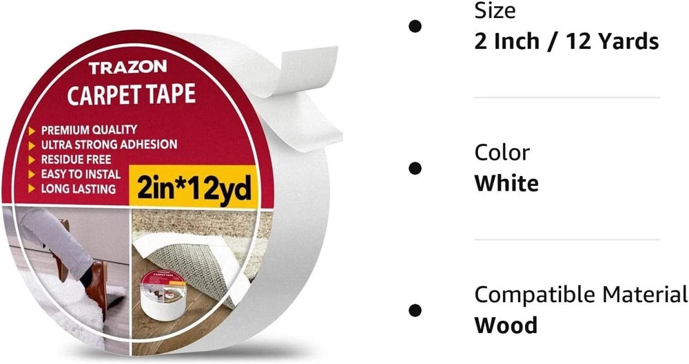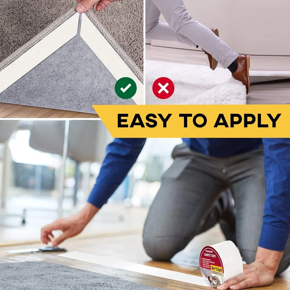 Carpet Tape Double Sided Rug Tape Grippers for Hardwood Floors and Area Rugs Bin Color: White Material: Extra Sticky Double Sided Carpet Tape Number of Items 1 Special Feature: Wood-safe, Surface-finish safe, Residue-free, High tensile strength, Strong Adhesion, Weather and Moisture ResistantWood-safe, Surface-finish safe, Residue-free, High tensile strength, Strong Adhesion, Weather and Moisture Resistant About this item Hot Melt Technology for Extra Sticking Power. Get a rug holder that will finally do its job! Our hot melt double stick carpet tape is highly adhesive compared to acrylic tapes. It offers an outstanding holding power to fix your rugs, runners, carpets, or other stuff you want to keep in its place. Because of increased tensile strength, our two sided carpet tape will be doing its sticky job for 6 months and more. One, Two, Three, and it’s Ready. Get annoyed by the tape all torn and gummed up on your scissors no more. 2 sided carpet tape has never been so easy to cut, handle, apply, or remove. Just cut the required length with a kitchen or knife and stick it to the surface. You can also remove the tape with one move without the need to scrape it off the floor. No More Glue on the Surface. Excellent adhesion doesn’t mean your stuff will all get messy. We offers a double sided tape for carpet that will keep all your mats, rags, and carpets in place while being residue-free. It means that when the time comes to change the tape, you won’t see sticky residues on the surface. In this way, our rug tape works great even on delicate surfaces like vinyl, laminate flooring, and more. Multi-Purpose Use you’ll Love. This floor mat tape is suitable for a wide range of applications. Because it is resistant to water and high temperatures, this carpet tape for area rugs delivers excellent adhesive qualities in any condition. You can use this carpet tape for area rugs on hardwood or as a rug stopper in the bathroom. It is also a great carpet tape for laminate floors and gym mats. Secure unfixed flooring covers with our double sided rug tape. Your Loved Ones are in Safety Now. Protect your toddlers, kids, senior family members from falling on the unstable surface. Our double sided tape for rugs reliably secures the mat to the surface so that it doesn’t move here and there. You and your dearest are now protected from bruises and those awkward situations when you slip and hurt your arm, back, leg, or head. This rug grip tape will ensure all your family members and guests can walk and play around in your place safely.