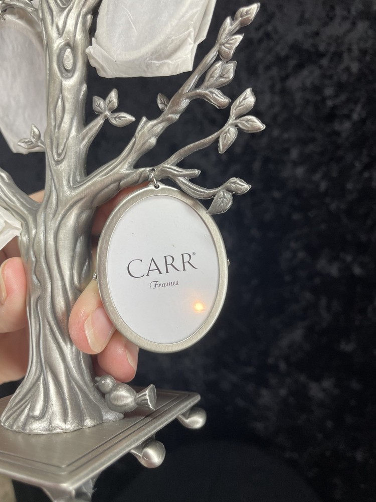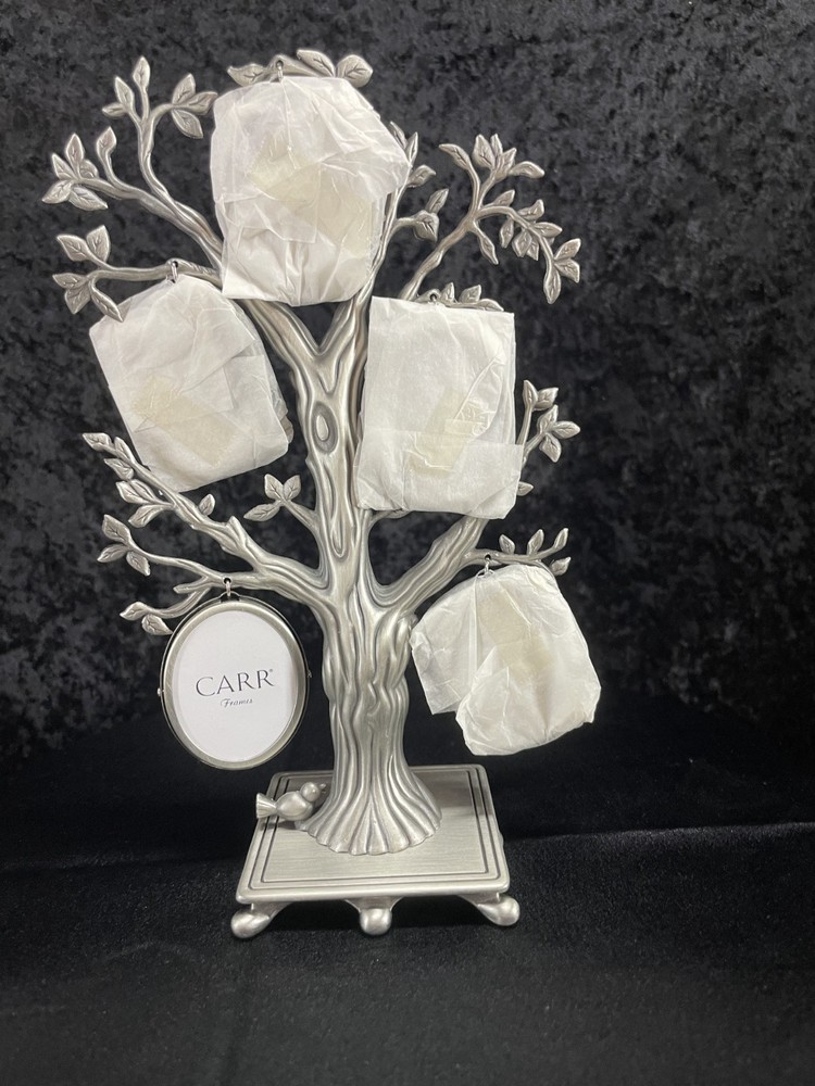 Carr Family Tree 5 Oval Picture Frames Hanging Pewter Metal Free Standing 8.5” The unit is unused, but without a box. The frames were wrapped for protection until I unwrapped one and took photos today. 5 oval picture frames in a vintage/retro style. The tree is pewter metal Holds up to 10 photos sized at 1.75 inches x 1.5 inches. The frames have a silver color. and The ensemble measures 8.5 inches in height, and 5" wide. I'm always willing to combine orders to save on shipping costs. Cleaning out grandparent’s, parent’s and my smoke free homes. What will we list next??