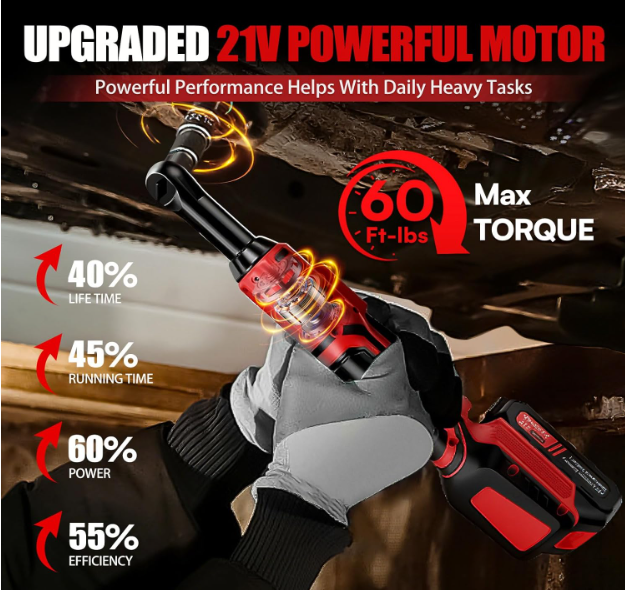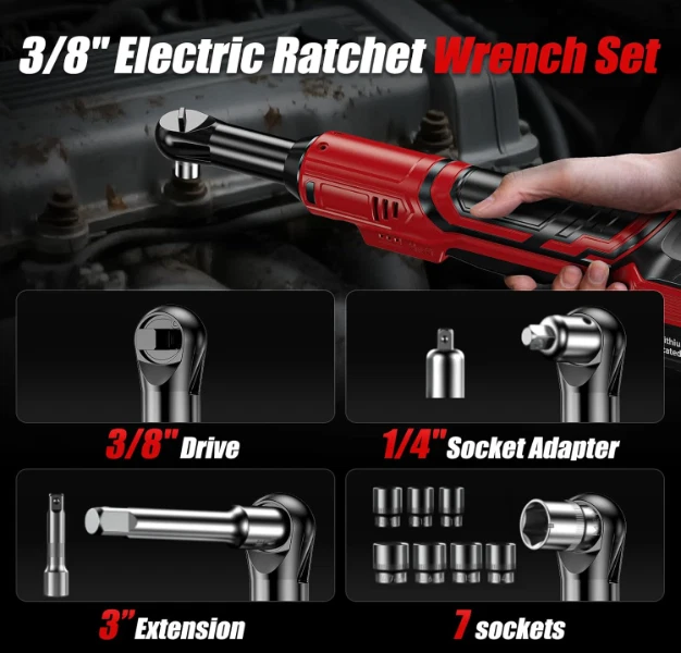 Carraca eléctrica inalámbrica 3/8” 21V, 80 Nm, 2 baterías, velocidad variable, extensión. Rojo 🔧 MOTOR SIN ESCOBILLAS DE 21 V Y PAR DE 80 Nm La llave de trinquete inalámbrica de 3/8'' está impulsada por un motor sin escobillas de 21 V y ofrece un par de 80 Nm (60 pies-lb), un 60 % más eficiente que una llave de trinquete convencional. Equipada con un gatillo de velocidad variable de 400 RPM, cuanto más fuerte presione, más rápido funcionará. La llave de trinquete eléctrica satisface las necesidades de diversas industrias ligeras. 🧰 DISEÑO COMPACTO CON CABEZAL DE EXTENSIÓN El juego de llaves de trinquete eléctricas está fabricado con aleación de alta calidad. Pesa solo 1,4 kg. El destornillador de trinquete a batería tiene un cuello de 10 cm y un cabezal compacto de 9,5 mm que permite acceder a cualquier espacio pequeño para extraer e instalar tornillos. En comparación con otras llaves de trinquete eléctricas de cabezal corto, la llave de trinquete extendida inalámbrica evita lastimarse los nudillos. Además, la empuñadura suave y aislada absorbe los impactos, reduce la fatiga de las manos y facilita el trabajo. 🔋 2 BATERÍAS DE 2000 mAh Las llaves de trinquete eléctricas de 21 V incluyen dos baterías de 2000 mAh y un cargador rápido que dura hasta más de 40 minutos cada una. En comparación con otras baterías de 12 V y 18 V, puede extender la autonomía en más de un 50 %. Puede alternar su uso sin problemas, garantizando un flujo de trabajo ininterrumpido para proyectos extensos. 📦 QUÉ INCLUYE La llave de trinquete inalámbrica combina portabilidad y potencia. Equipada con una trinquete inalámbrica de 3/8". Incluye dos baterías de 21 V y 2,0 mAh. Incluye un cargador. Incluye 7 llaves de vaso (10, 11, 12, 13, 14, 15 y 17 mm). Incluye un adaptador de 1/4". Incluye una varilla de extensión de 3". Incluye un manual. Ideal para reparadores profesionales y aficionados al bricolaje. 🔄 CONTROL DE AVANCE/RETROCESO Y DISEÑO DE SEGURIDAD La llave de trinquete inalámbrica cuenta con un interruptor de avance y retroceso y un interruptor de bloqueo. Avance para apretar los pernos y retroceda para desenroscarlos. El diseño de bloqueo de seguridad evita que el interruptor se active accidentalmente. La trinquete a batería con luz LED integrada puede iluminar, mejorando la visibilidad en espacios oscuros o reducidos. Trabaje eficientemente sin iluminación adicional.