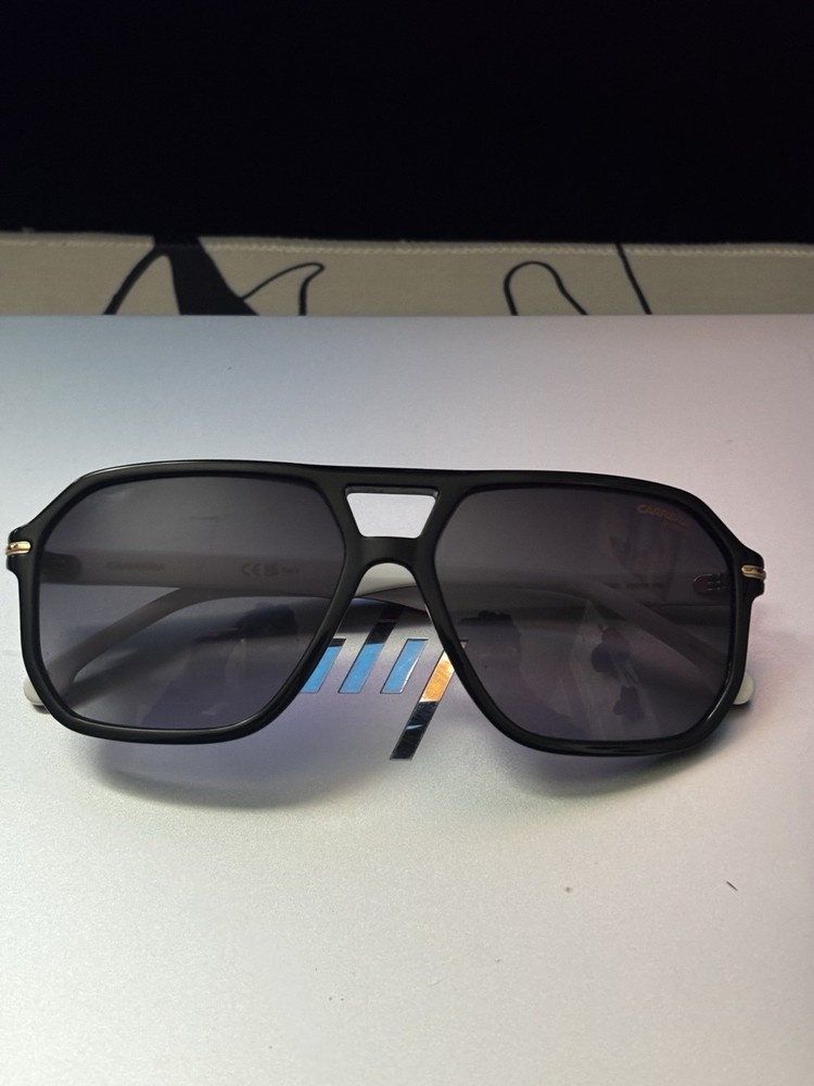 The Carrera 302/S Sunglasses in Striped Black Gray Shaded are a stylish and classic accessory for men. This rectangular frame with a 59mm eye size and 15mm bridge size features full rims and temple lengths of 145mm. The gray shaded lenses provide optimal protection and style for adult wearers looking for a high-quality, 100% authentic sunglasses option from the renowned Carrera brand. NO ORIGINAL CASE