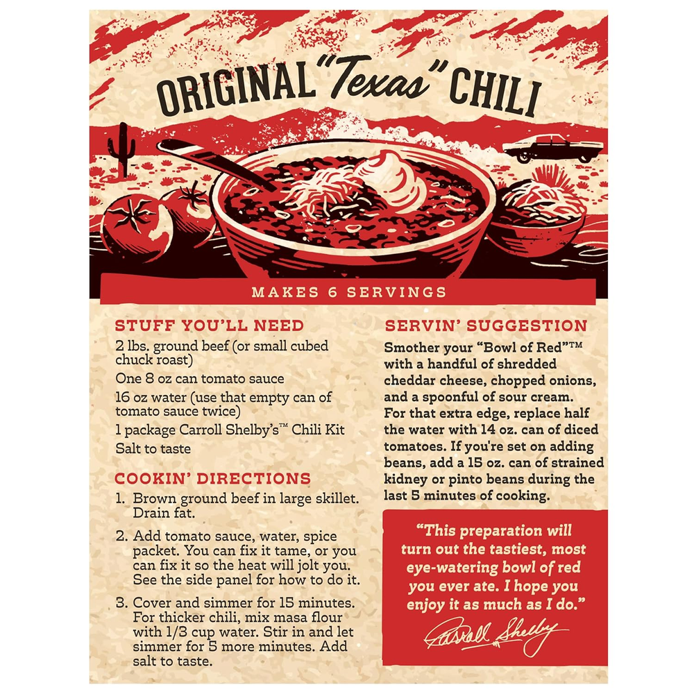 Hot or Mild Chili: This custom chili mix features individual seasoning packets of cayenne and Masa flour to make 2 pounds of meat mild or spicy! Six servings per container and gluten free Authentic Chili: Crafted with bold creativity by Carroll Shelby himself, this chili kit is just what you need to create authentic, Texas-style chili right at home Texas Chili Mixes: Our mixes are perfect for hearty chilis, burger toppings, tacos, salads and other favorites. Create great-tasting combinations for everyday meals, tailgate parties, backyard BBQs and more Carroll Shelby's Chili: All of our custom chili kits have sophisticated flavor and feature individual seasoning packets to customize to taste. Try it for Tomatillo, Poblano Salsa, Quick Chili Mole and more The Chili: In 1967, racecar legend Carroll Shelby transformed a Texas ghost town into the first-ever chili cook-off at Terlingua. What began as a non-stop party of fire-breathing chiliheads morphed into an annual world famous championship Carroll Shelby's custom chili kit features individual packets of spices, cayenne, and masa flour that let you season two pounds of meat just the way you like. Delicious on its own or atop burgers, tacos, or salads. Just add creativity and your own special fixin's.
