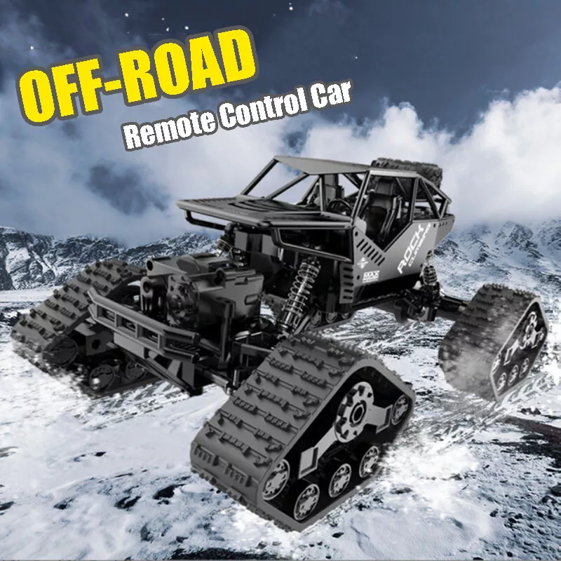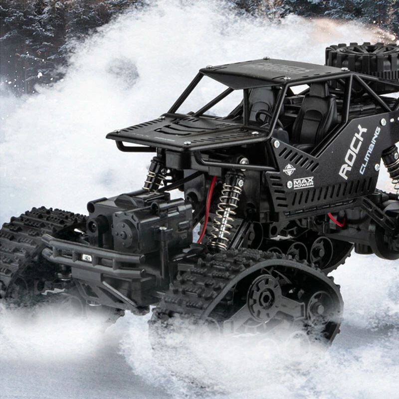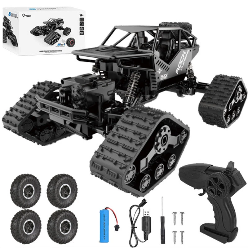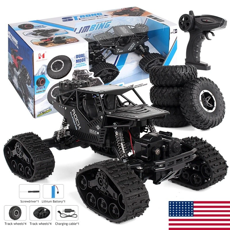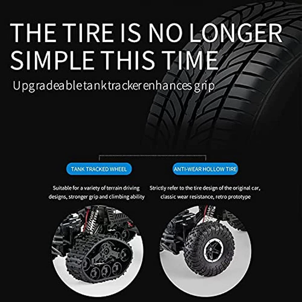 【2 in 1 Climbing Off-Road Truck】 - Our remote control car is equipped with 2 set of tire, suitable for all terrain like sand, mud, stones or rugged mountain roads One is wear-resistant hollow tires, which are designed by our designers strictly in accordance with the original car tires. It has the characteristics of wear-resisting, climbing and off-road. The other is the tank track wheel, which uses upgraded simulated track tires and has a stronger grip. 【Alloy Four-Wheel Drive&Strong Shockproof System】 Introduced advanced technology, the rc cars body is made of high-quality upgraded ABS plastic and metal materials, giving the vehicle body a strong collision resistance and a strong shock-resistant, which is safer and more stable. Utilized healthy paint spray materials on the surface, it's moisture-proof and will never fade. Perfect remote con trol car for boys 8-12 birthday Xmas gift. 【 1 Rechargeable Batteries For Extended Running Time】 Our RC truck comes with two 3.7V, 1200 mAh batteries, it is more durable than other regular toy cars. Due to battery upgraded, each battery pack can be used around 40 minutes ceaselessly, which provides longer entertainment performance. The USB line that comes with the car offers more convenience to charge. 【Independent Signal No Interference】 Equipped with a 2.4GHz remote control system what it does is that it can offer a stable signal and it has a non-jamming function. It can prevent signal interferen ce when multiple vehicles playing at the same time. The control distance is about 132ft. Which enables your kids and their friends to play together, sharing together. It is a great off-road monster tr uck for indoor and outdoor. 【BEST PERFECT GIFT FOR KIDS】 An cool toy grade rc car gift for boys and girls, an ideal birthday or any occasional gift. If you are looking for an exciting and extra cool present, then you will love our radio controlled cars. Racing your family or friends is always exciting and everyone can join in the fun. Packing List : 1*RC Car 1*USB Charging Cable 1*User Manual 1 *3.7V/1200mAh Rechargeable Batteries 1*Remote Controller (Battery is Not Included) 4*Wheels (climbing/track wheels) 1*Screwdriver KINDLY NOTE: Do not overuse the battery, when the battery is low, please charge it as soon as possible to prevent the battery from over-discharge. To maintain the stability condition of the battery, please remove it from the toy truck and turn off the truck when charging, otherwise, it can damage the battery lifespan.