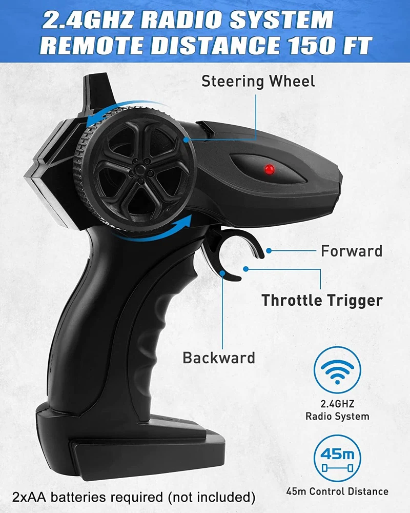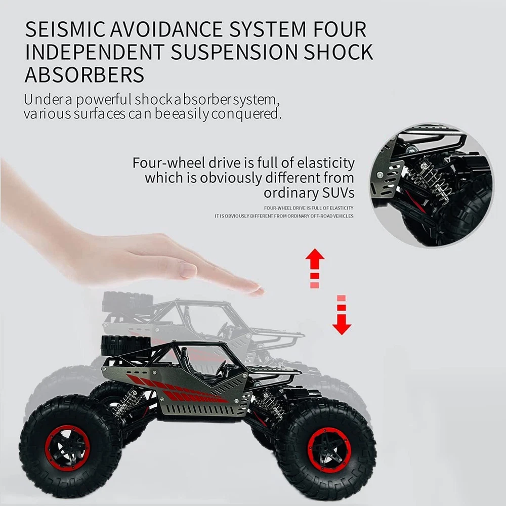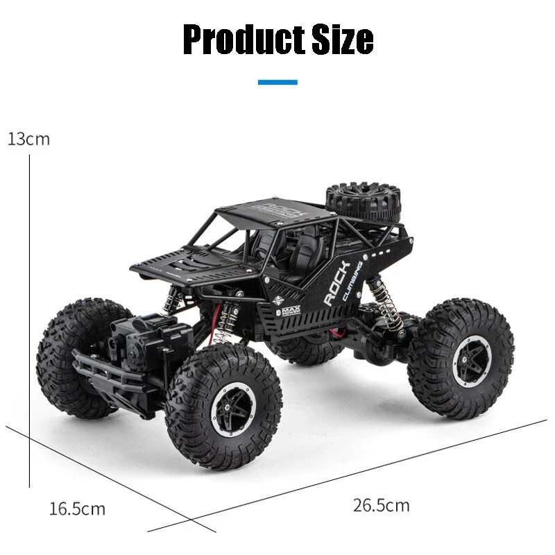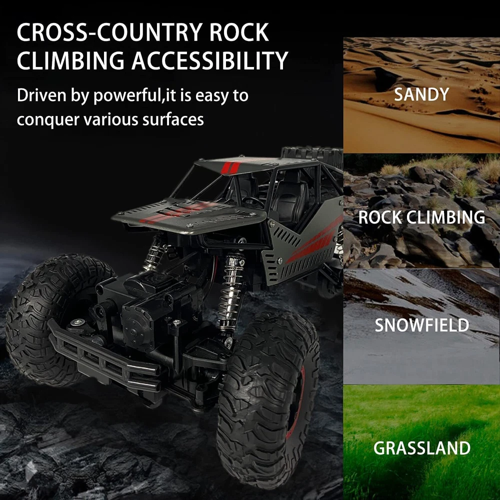 【2 in 1 Climbing Off-Road Truck】 - Our remote control car is equipped with 2 set of tire, suitable for all terrain like sand, mud, stones or rugged mountain roads One is wear-resistant hollow tires, which are designed by our designers strictly in accordance with the original car tires. It has the characteristics of wear-resisting, climbing and off-road. The other is the tank track wheel, which uses upgraded simulated track tires and has a stronger grip. 【Alloy Four-Wheel Drive&Strong Shockproof System】 Introduced advanced technology, the rc cars body is made of high-quality upgraded ABS plastic and metal materials, giving the vehicle body a strong collision resistance and a strong shock-resistant, which is safer and more stable. Utilized healthy paint spray materials on the surface, it's moisture-proof and will never fade. Perfect remote con trol car for boys 8-12 birthday Xmas gift. 【 1 Rechargeable Batteries For Extended Running Time】 Our RC truck comes with two 3.7V, 1200 mAh batteries, it is more durable than other regular toy cars. Due to battery upgraded, each battery pack can be used around 40 minutes ceaselessly, which provides longer entertainment performance. The USB line that comes with the car offers more convenience to charge. 【Independent Signal No Interference】 Equipped with a 2.4GHz remote control system what it does is that it can offer a stable signal and it has a non-jamming function. It can prevent signal interferen ce when multiple vehicles playing at the same time. The control distance is about 132ft. Which enables your kids and their friends to play together, sharing together. It is a great off-road monster tr uck for indoor and outdoor. 【BEST PERFECT GIFT FOR KIDS】 An cool toy grade rc car gift for boys and girls, an ideal birthday or any occasional gift. If you are looking for an exciting and extra cool present, then you will love our radio controlled cars. Racing your family or friends is always exciting and everyone can join in the fun. Packing List : 1*RC Car 1*USB Charging Cable 1*User Manual 1 *3.7V/1200mAh Rechargeable Batteries 1*Remote Controller (Battery is Not Included) 4*Wheels (climbing/track wheels) 1*Screwdriver KINDLY NOTE: Do not overuse the battery, when the battery is low, please charge it as soon as possible to prevent the battery from over-discharge. To maintain the stability condition of the battery, please remove it from the toy truck and turn off the truck when charging, otherwise, it can damage the battery lifespan.