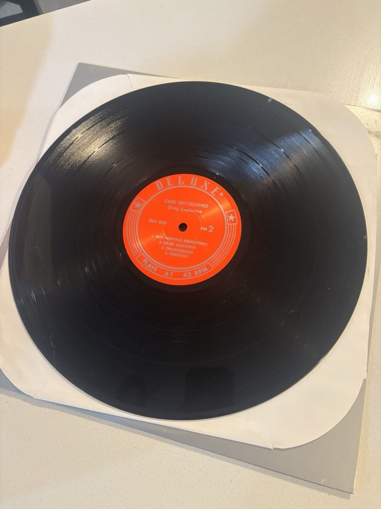 The product is a first pressing of the LP record "Drag Explosive" by Cars Get Crushed, released by Deluxe in the 1995. The record is in a 12" format with stereo audio. The record comes in a cardboard sleeve, making it a valuable addition for fans of vintage American emo / indie rock music.