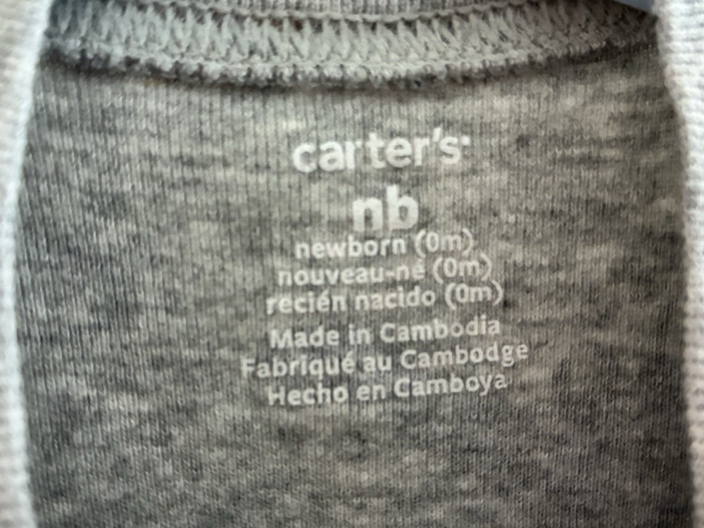 Country of Origin: Cambodia Department: Boys Neckline: Henley Number of Pieces: 1 Piece Pattern: Animal Print Style: Bodysuit Brand: Carter's Set Includes: Bodysuit Features: Comfort, Easy Care, Lightweight, Stretch Material: 100% Cotton Occasion: Casual Season: Spring, Summer Color: Gray Seller Notes: “In very good condition. Free of rips or stains.” Theme: Animals, Dinosaurs Closure: Snap Type: One-Piece Character: Boy Sleeve Length: Short Sleeve Size: Newborn Garment Care: Machine Washable