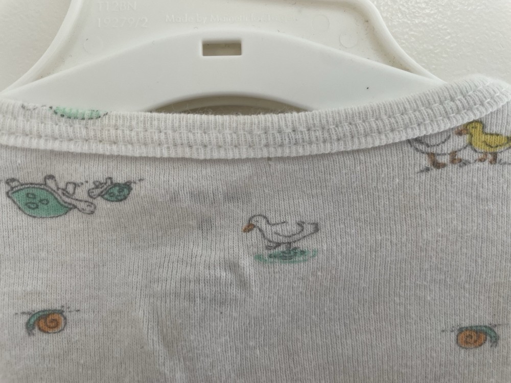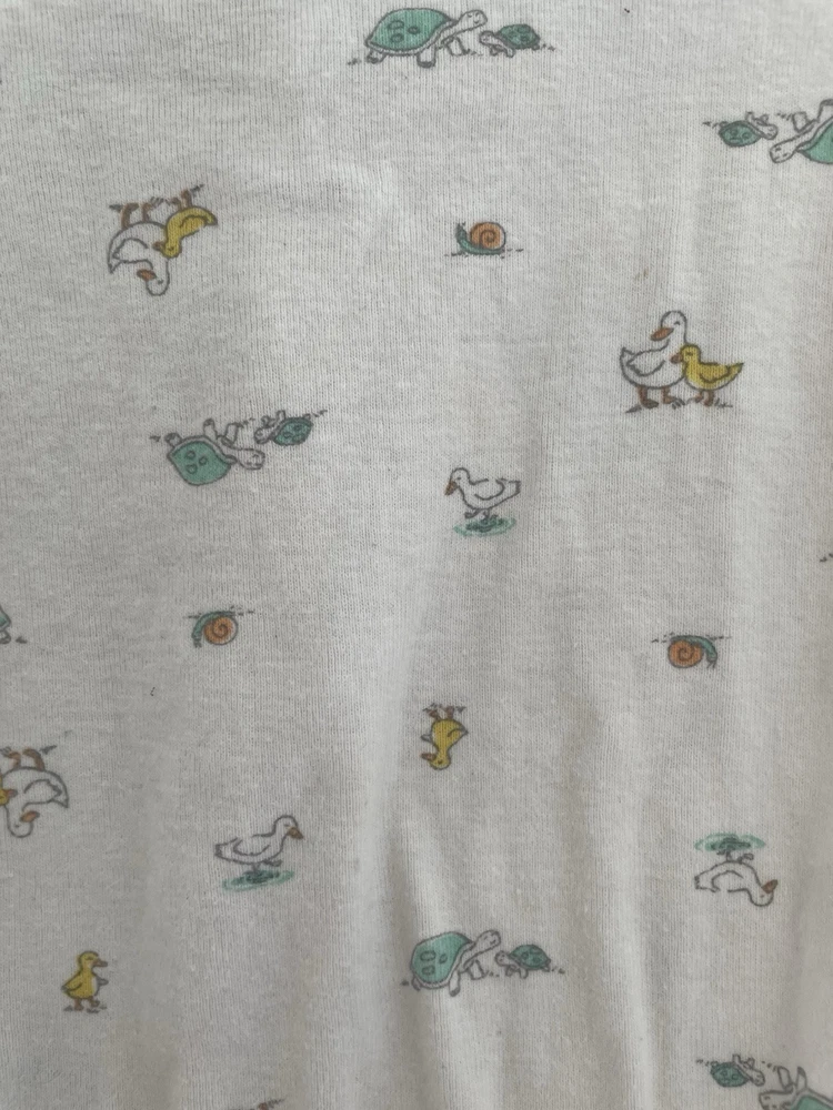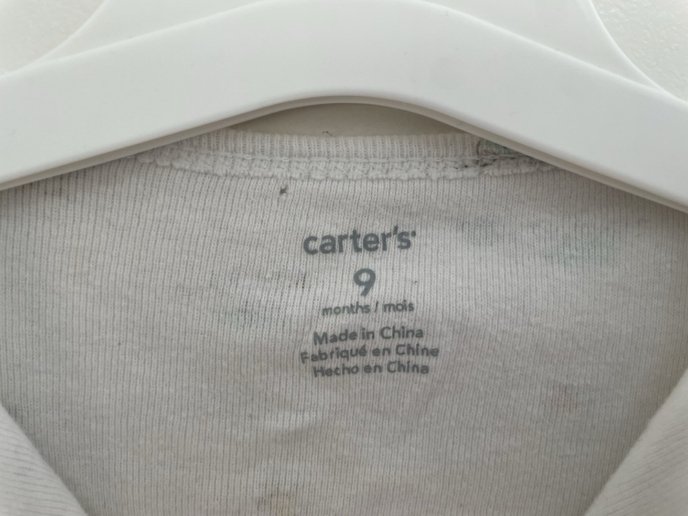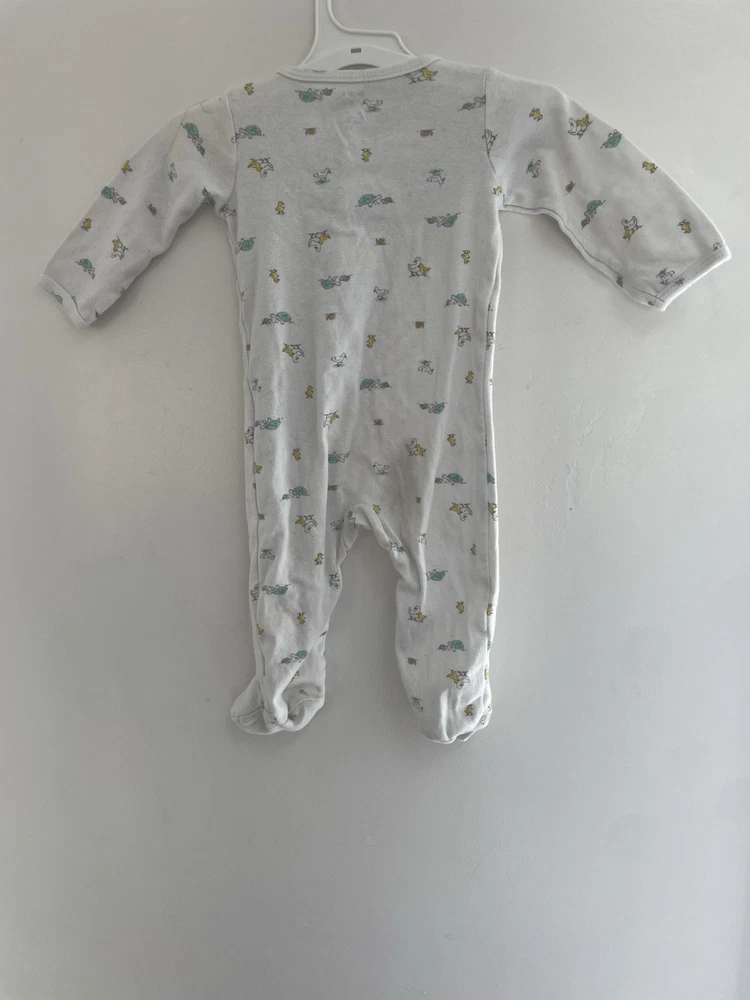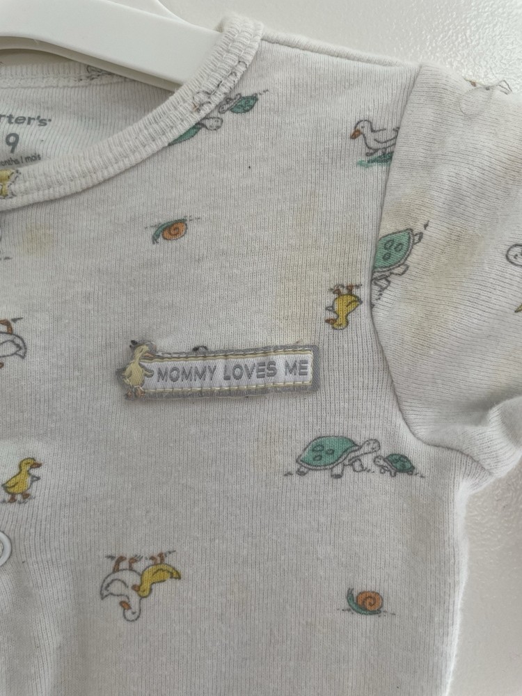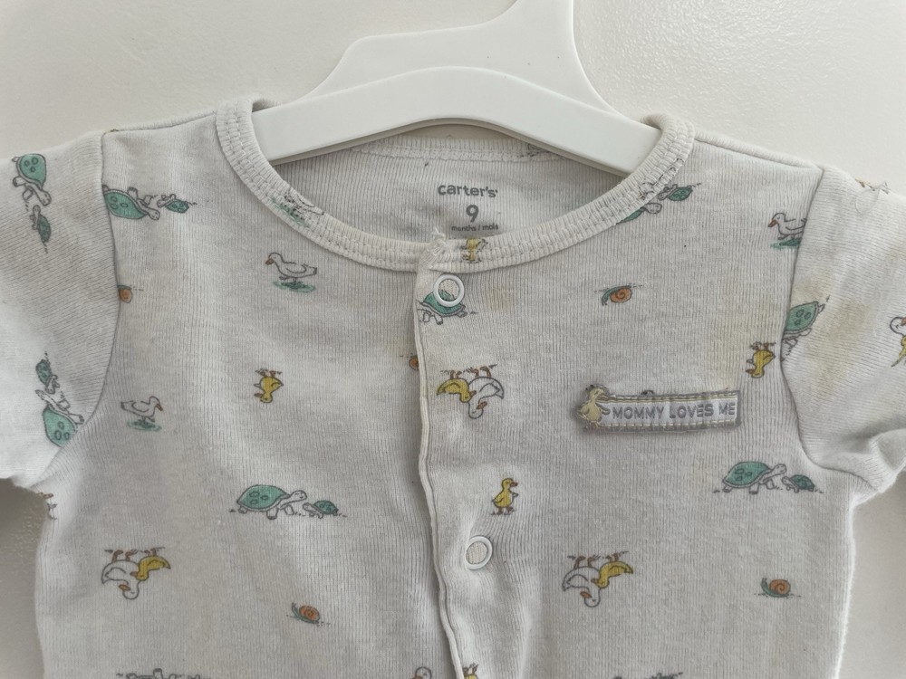 Pattern: Animal Print Garment Care: Machine Washable Number of Pieces: 1 Piece Size: 9 Months Material: 100% Cotton Style: Sleep & Play Brand: Carter's Seller Notes: “In fair condition. There is a small hole at the top by the neckline and light stains on the front.” Occasion: Casual Sleeve Length: Long Sleeve Type: One-Piece Character: Boy Closure: Snap Department: Boys Features: Comfort, Easy Care, Lightweight, Stretch Theme: Animals, Colorful, Duck, Turtle, Snail Color: White Country of Origin: China Season: Fall, Spring, Winter