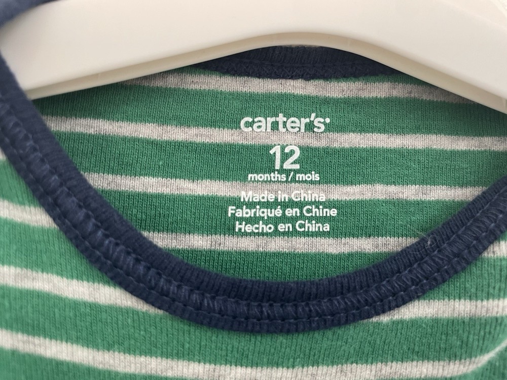 Carter's Baby Boy Cute Dog Graphic Striped Cotton Long Sleeve Bodysuit Green 12M. Condition is pre-owned. Smoke free, pet free home. Shipped via USPS Ground Advantage. In very good condition. Free of rips or stains.