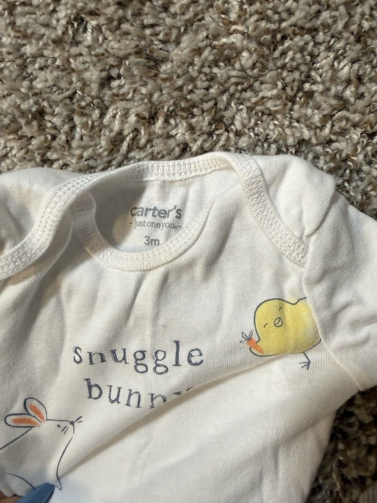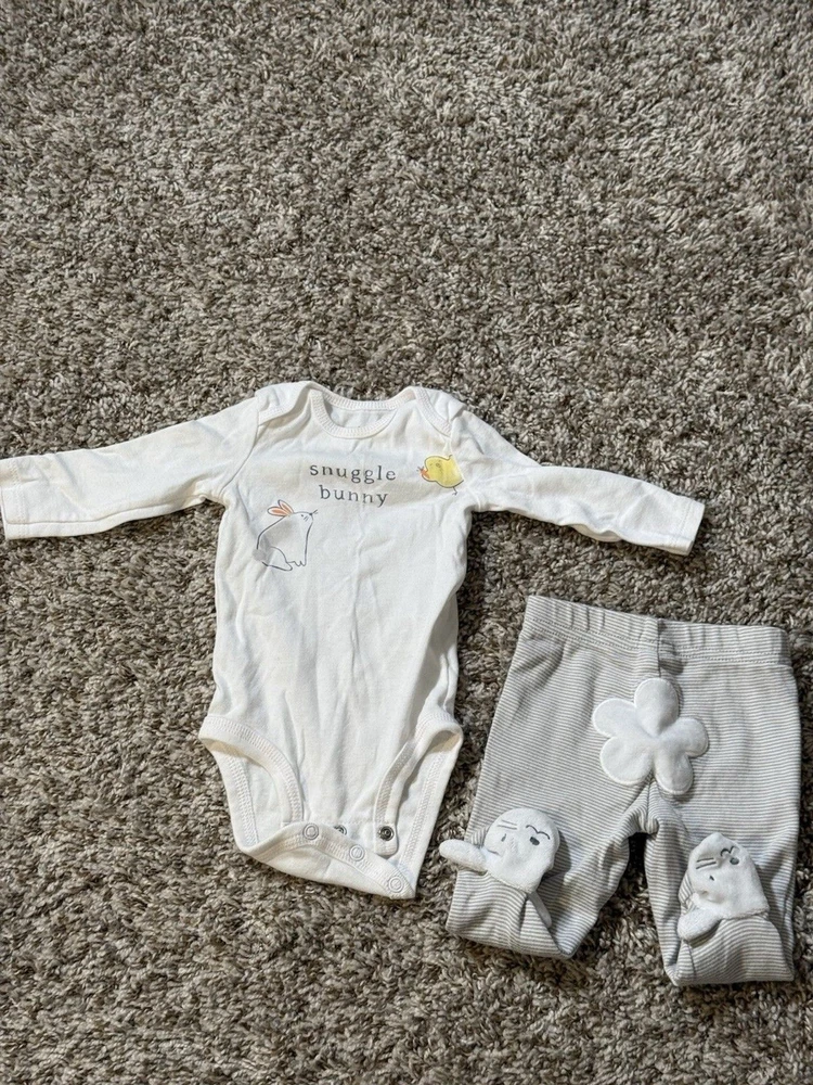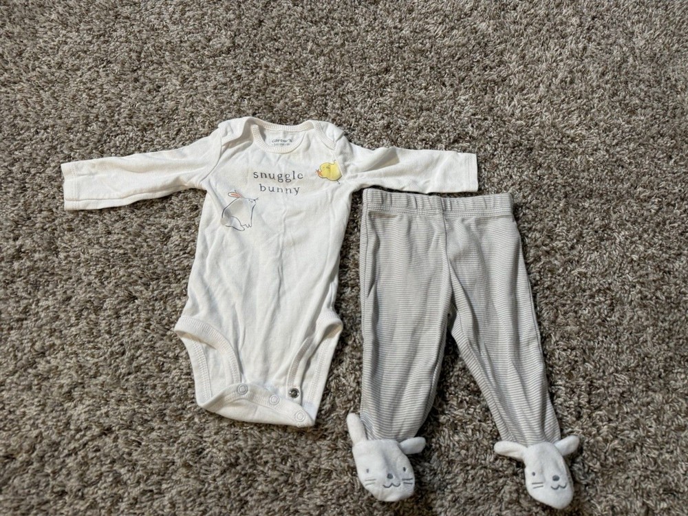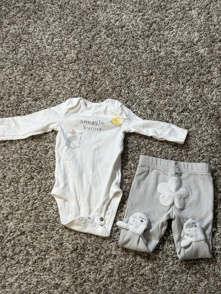 Carter’s baby outfit set in size 3 months, originally purchased specifically for Easter and worn one time only. This adorable neutral set features a long-sleeve ivory bodysuit with sweet bunny and chick graphics, paired with gray and white striped pants with attached bunny face footies and soft 3D ears, making it perfect for Easter photos, spring celebrations, or gifting. Made from soft, comfortable cotton with lap shoulders and snap closure for easy changes, and a gentle elastic waistband on the pants. Used once for Easter, then stored, this set is in excellent condition with no stains, holes, or wear. Ships fast — usually within 24 hours.
