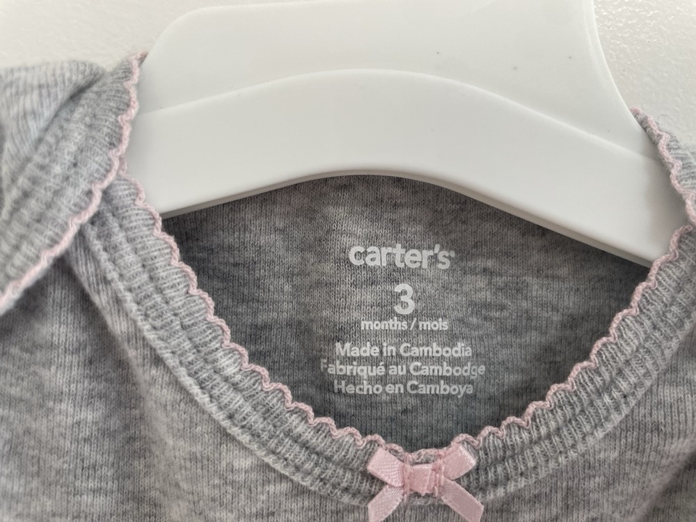 Color: Gray Number of Pieces: 1 Piece Set Includes: Bodysuit Seller Notes: “In very good condition. Free of rips or stains.” Season: Spring, Summer Style: Bodysuit Brand: Carter's Features: Comfort, Easy Care, Lightweight, Stretch Character: Snuggle Pattern: Solid Size: 3 Months Occasion: Casual Material: 100% Cotton Department: Girls Country of Origin: Cambodia Garment Care: Machine Washable Closure: Snap Sleeve Length: Short Sleeve Type: One-Piece Accents: Bow, Embroidered, Lace