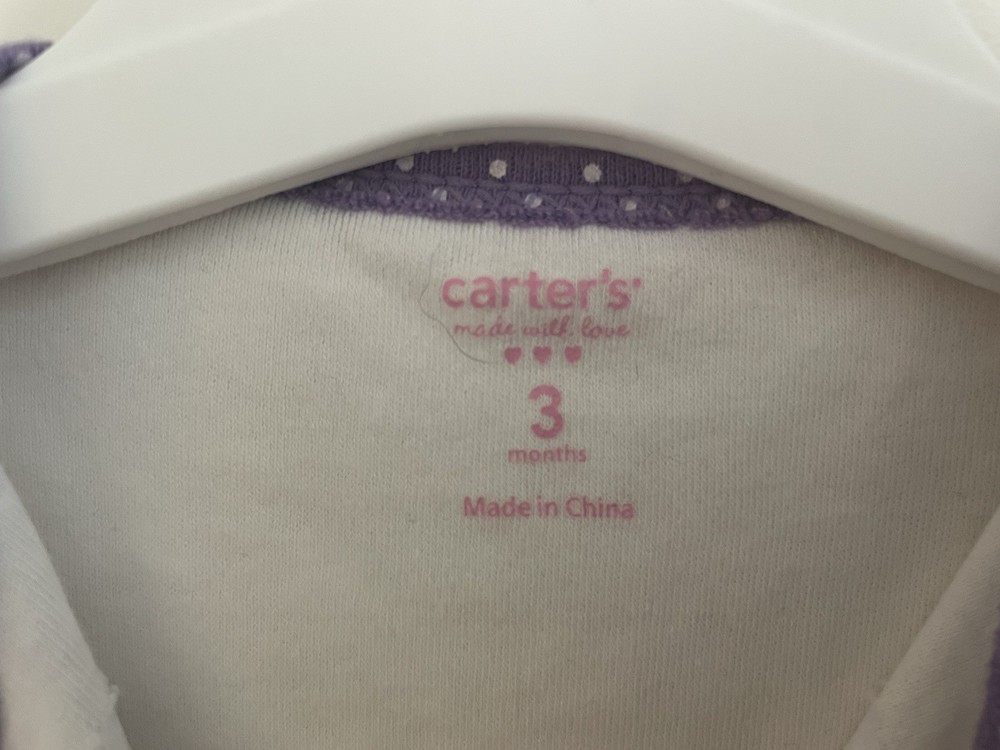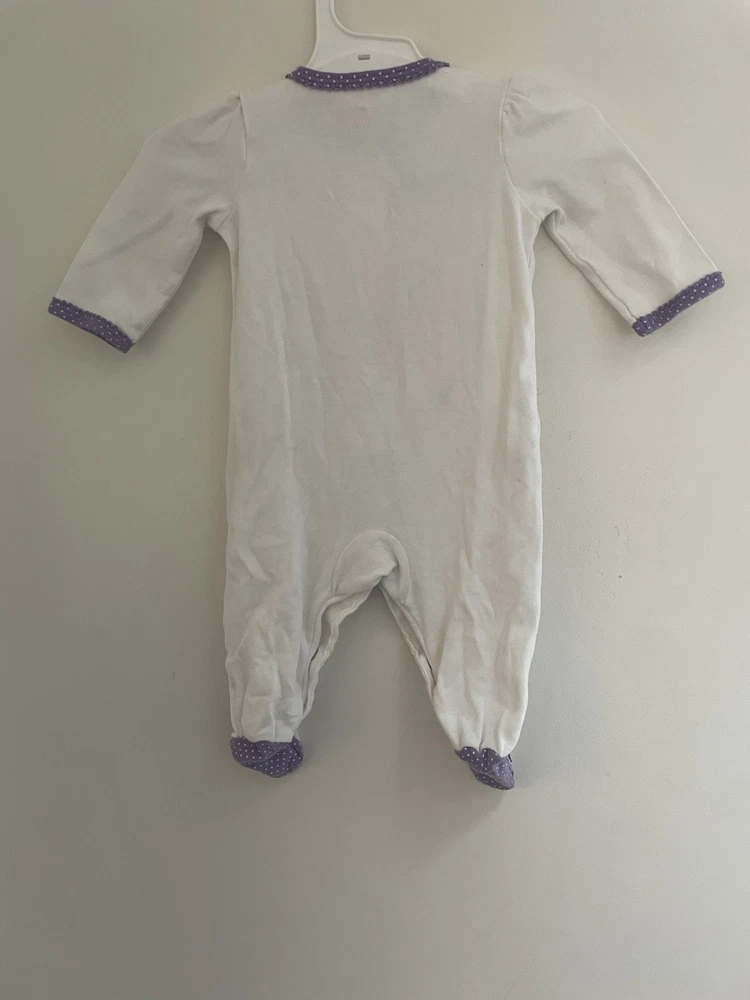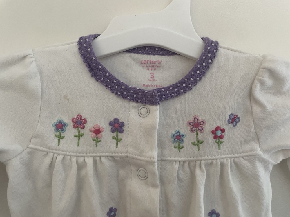 Pattern: Flowers Type: One-Piece Size: 3 Months Color: White Garment Care: Machine Washable Season: Fall, Spring, Summer, Winter Features: Comfort, Easy Care, Lightweight, Stretch Occasion: Casual Number of Pieces: 1 Piece Department: Girls Sleeve Length: Long Sleeve Closure: Snap Seller Notes: “In very good condition. Free of rips or stains.” Country of Origin: China Style: Sleep & Play Material: 100% Cotton Brand: Carter's Theme: Colorful, Flower Accents: Bow, Embroidered, Lace, Pleated