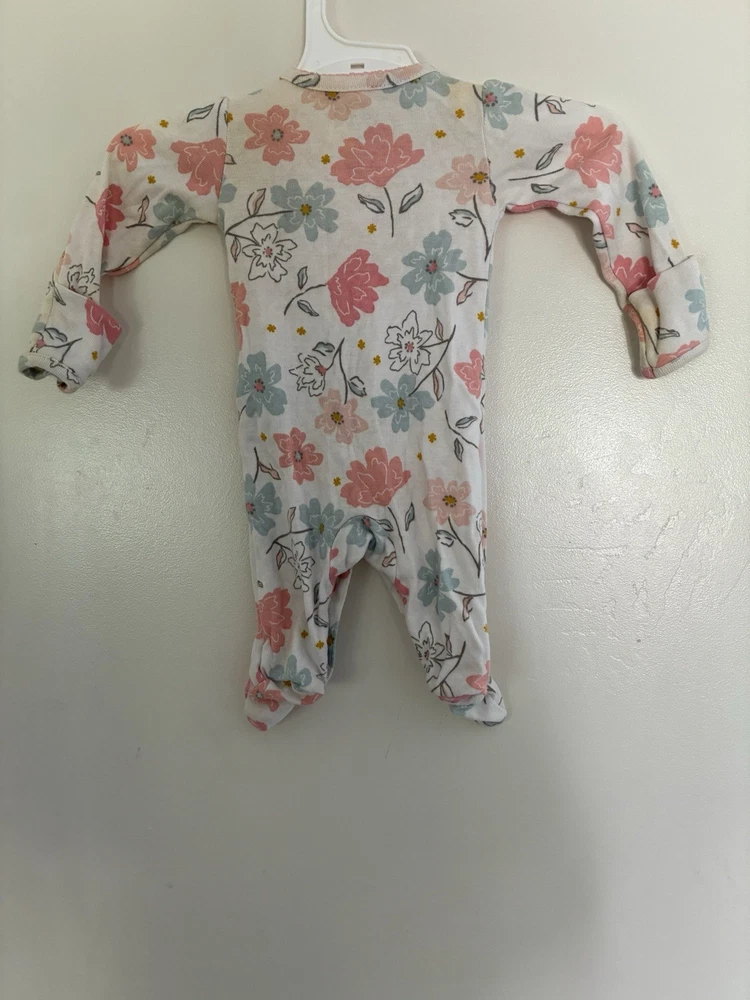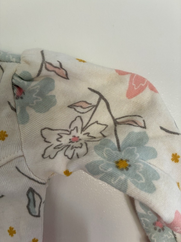 Carter's Baby Girls Colorful Floral 100% Cotton Snap-Up Sleep & Play White NB. Condition is pre-owned. Smoke free, pet free home. Shipped via USPS Ground Advantage. In fair condition. There are stains all over the top of the sleep & play. Free of rips.