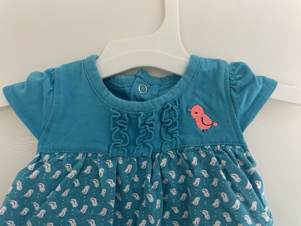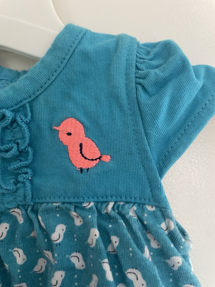 Carter's Baby Girls Cute Allover Bird Print Ruffle Short Sleeve Dress Blue 0-3M. Condition is pre-owned. Smoke free, pet free home. Shipped via USPS Ground Advantage. In good condition. There are light stains on the front. Free of rips.
