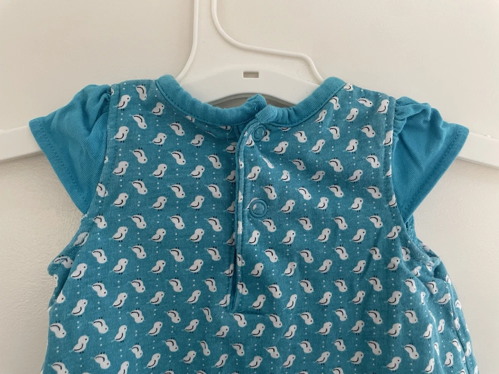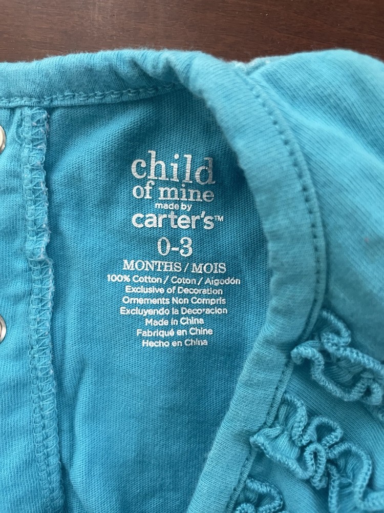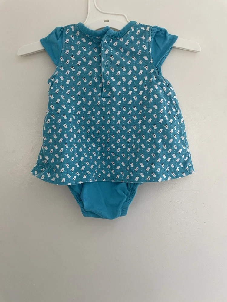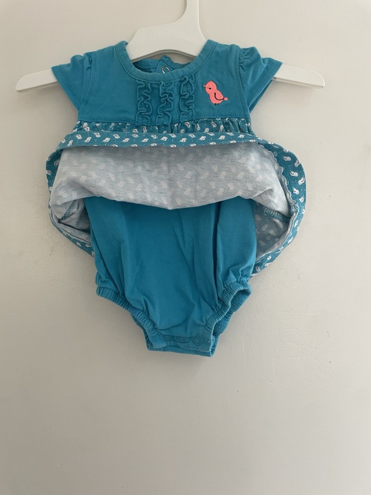 Brand: Carter's Features: Lightweight, Stretch Country of Origin: China Size: 0-3 Months Seller Notes: “In good condition. There are light stains on the front. Free of rips.” Garment Care: Machine Washable Occasion: Casual Material: 100% Cotton Accents: Embroidered, Ruffle Department: Girls Dress Length: Knee Length Style: A-Line Theme: Animals, Bird Color: Blue Sleeve Length: Short Sleeve Pattern: Animal Print Closure: Snap Season: Spring, Summer