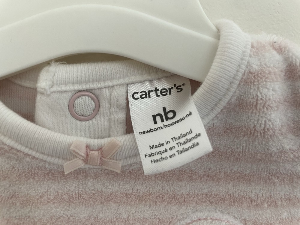Features: Comfort, Easy Care, Lightweight, Stretch Accents: Bow, Embroidered Brand: Carter's Theme: Animals, Bear Season: Fall, Spring, Winter Occasion: Casual Department: Girls Type: One-Piece Closure: Snap Country of Origin: Thailand Pattern: Striped Sleeve Length: Long Sleeve Fabric Type: Terry Number of Pieces: 1 Piece Garment Care: Machine Washable Style: Sleep & Play Size: Newborn Seller Notes: “In very good condition. Free of rips or stains.” Color: Pink Material: 14% polyester, 86% cotton