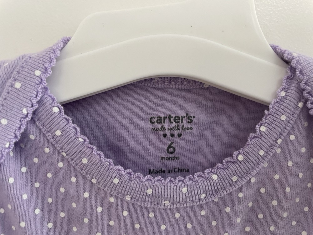 Season: Fall, Spring, Summer Closure: Snap Style: Bodysuit Type: One-Piece Color: Lavender Features: Comfort, Easy Care, Lightweight, Stretch Seller Notes: “In very good condition. Free of rips or stains.” Country of Origin: China Sleeve Length: Short Sleeve Neckline: Crew Neck Number of Pieces: 1 Piece Garment Care: Machine Washable Department: Girls Theme: Butterfly, Flower Material: 100% Cotton Set Includes: Bodysuit Size: 6 Months Brand: Carter's Occasion: Casual Pattern: Polka Dot