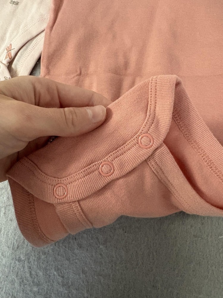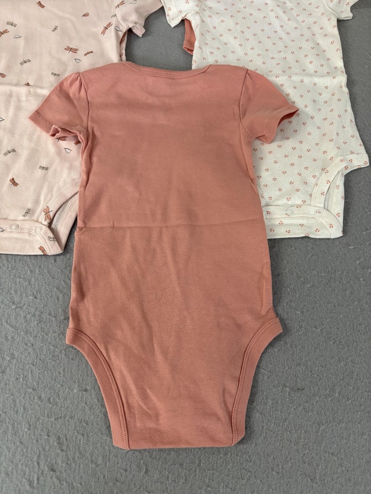 Brand: Carter's Item: 5-pack short-sleeve bodysuits/one-piece for girls Tag size: 24M (24 months) Designs: assorted florals and nature prints plus one with "smiles & sunshine" graphic Colors: shades of peach, pink, and white Features: soft jersey knit; crew neck; 3-snap bottom closure for easy diaper changes Made in Bangladesh (per inner neck print) Notes: One bodysuit retains the retail hang tag; mix-and-match prints