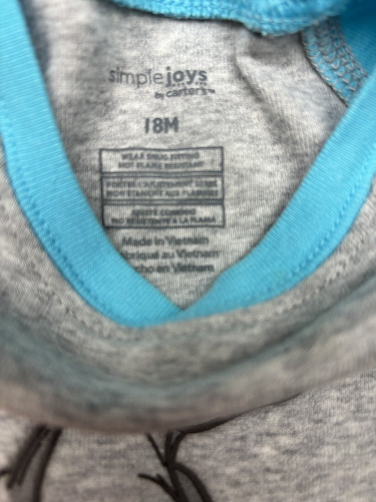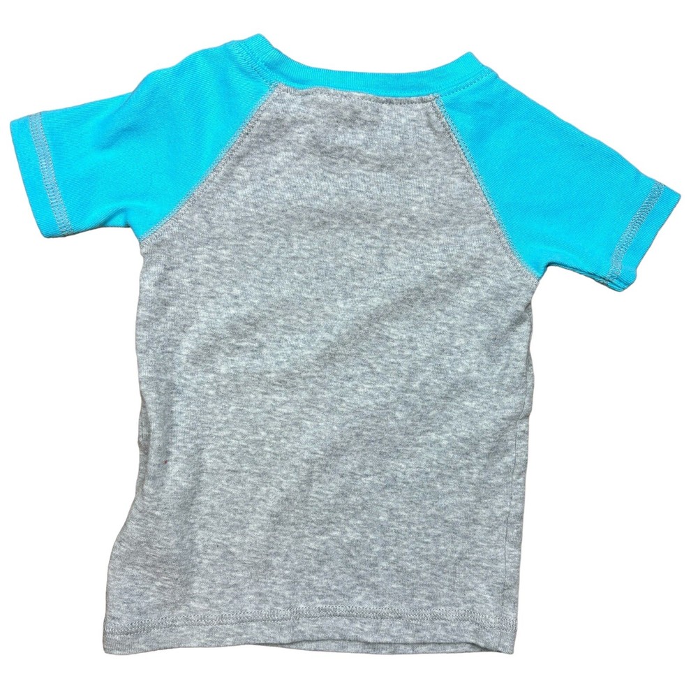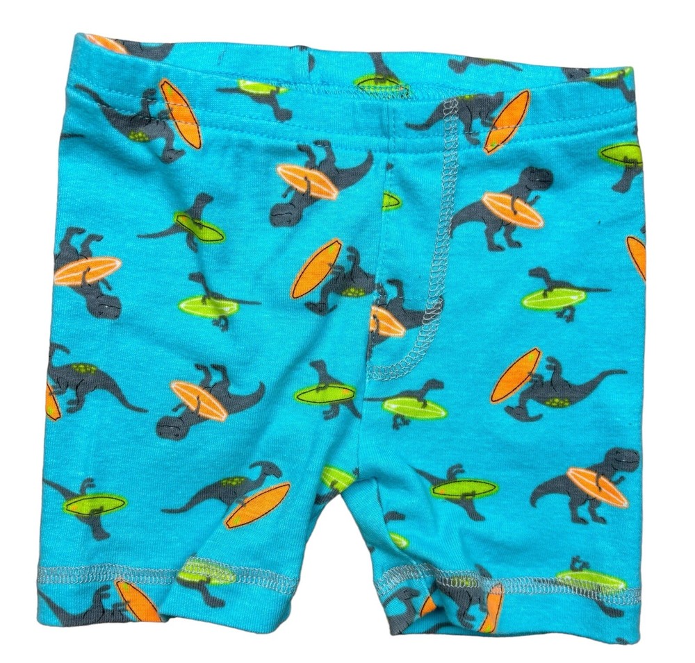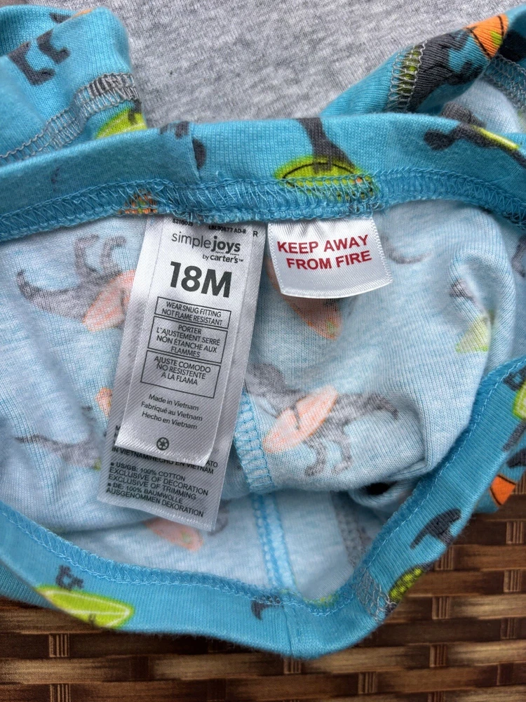 Get your little one ready for bed with this fun and comfortable two-piece pajama set from Carter's. The short-sleeved top features a cute animal print of surfing dinosaurs in aqua and gray, while the pullover closure ensures easy dressing. Made of soft cotton knit fabric, this set is perfect for cozy nights. Available in size 18 months, it's a great addition to any little boy's sleepwear collection.