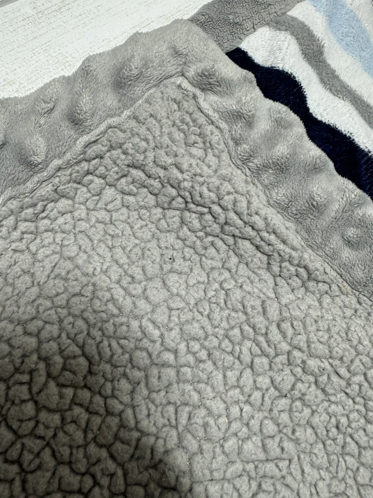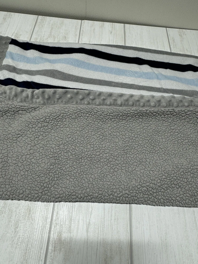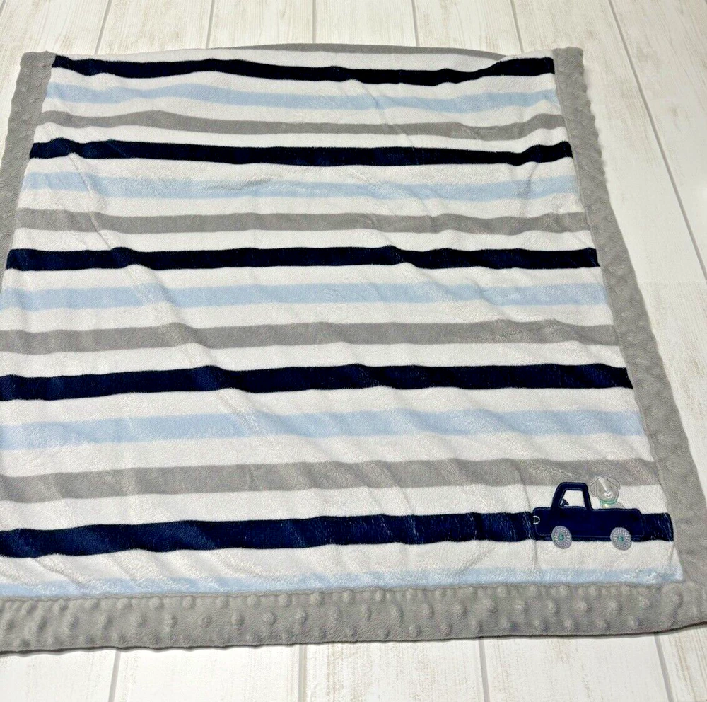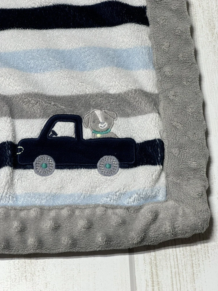 Carters Child Of Mine Grey Blue White Striped Puppy Dog Truck Baby Blanket plush Pre owned in great condition Measures approx. 40x30" See all photos