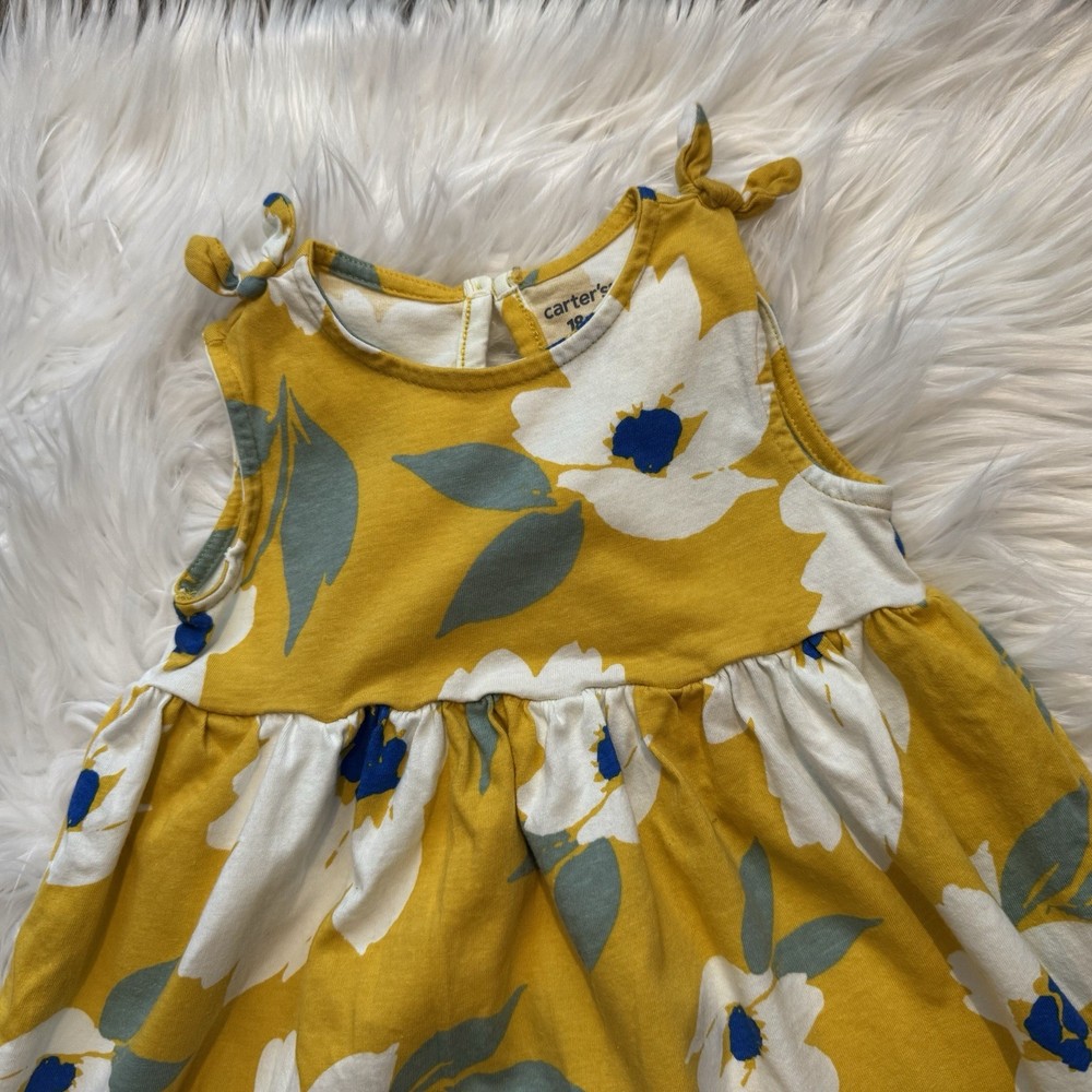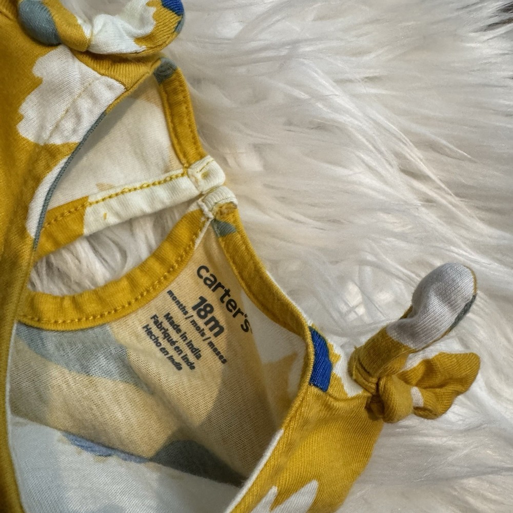 Carter’s baby girl sleeveless dress featuring a bright yellow floral print and cute tie shoulder straps. This lightweight sundress includes the original matching bloomers, creating a perfect coordinated outfit for warm weather. The soft breathable fabric and sleeveless design make it comfortable for everyday wear, summer outings, vacations, or photos. The cheerful floral pattern gives this outfit a sweet and classic seasonal look. Condition: Excellent used condition. Size: 18 Months Features: • Sleeveless sundress • Floral print design • Tie shoulder straps • Matching bloomers included • Lightweight and breathable fabric Perfect for summer outings, playdates, vacations, or casual everyday wear. Please review all photos carefully for details and condition. Smoke & Pet Free Home Thank you for shopping with South Peach Trends!
