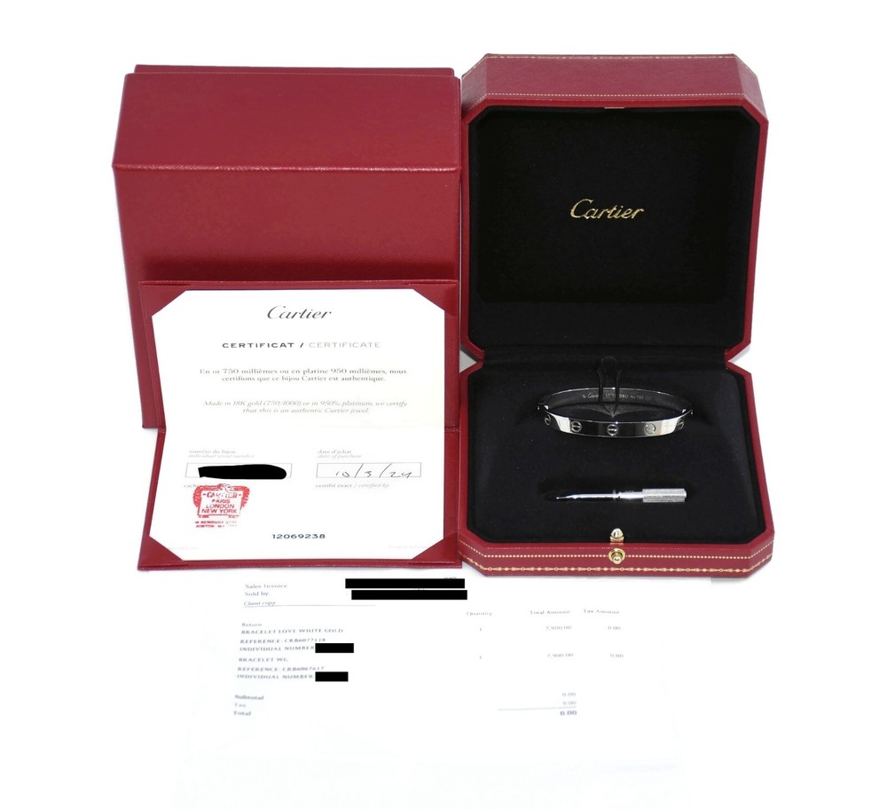 CARTIER 18K WHITE GOLD LOVE BRACELET SIZE:17 SKU:4-25 COMES WITH PURCHASE RECEIPT 100% AUTHENTIC WITH BOX AND CERTIFICATE