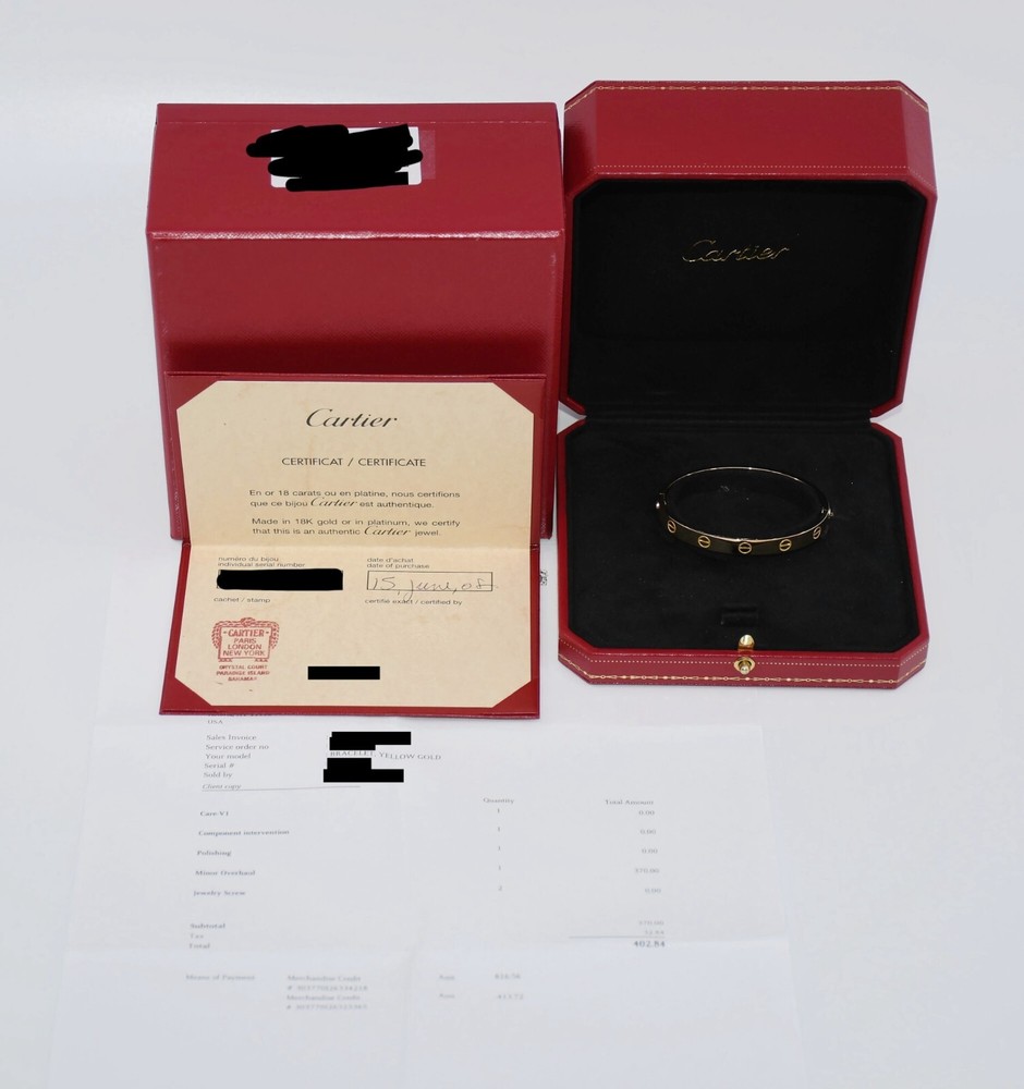 CARTIER 18K YELLOW GOLD LOVE BRACELET SIZE:16 SKU:9-24 COMES WITH CARTIER SERVICE RECEIPT 100% AUTHENTIC WITH BOX AND CERTIFICATE