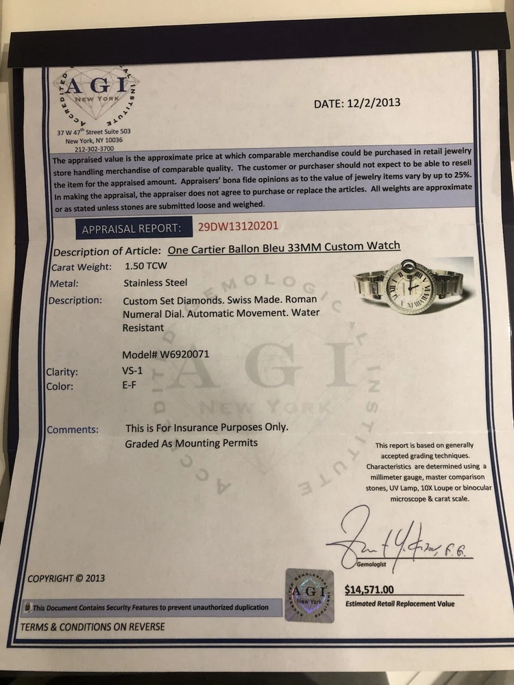 Purchased new through a reputable dealer of Cartier and other high-end timepieces. Lovingly worn for a year and a half and now my wife, a breast cancer survivor, wants to celebrate the end of her treatment journey with a new watch. Selling this to help finance that purchase. The bezel features a double row of professionally-set diamonds. 1.5 tcw, G color, VS clarity diamonds. Includes Cartier box and dated warranty card as pictured. Please contact me with questions or to request additional photos. I am a watch enthusiast and want to be sure I accurately represent its pre-owned condition.