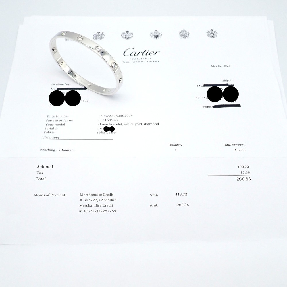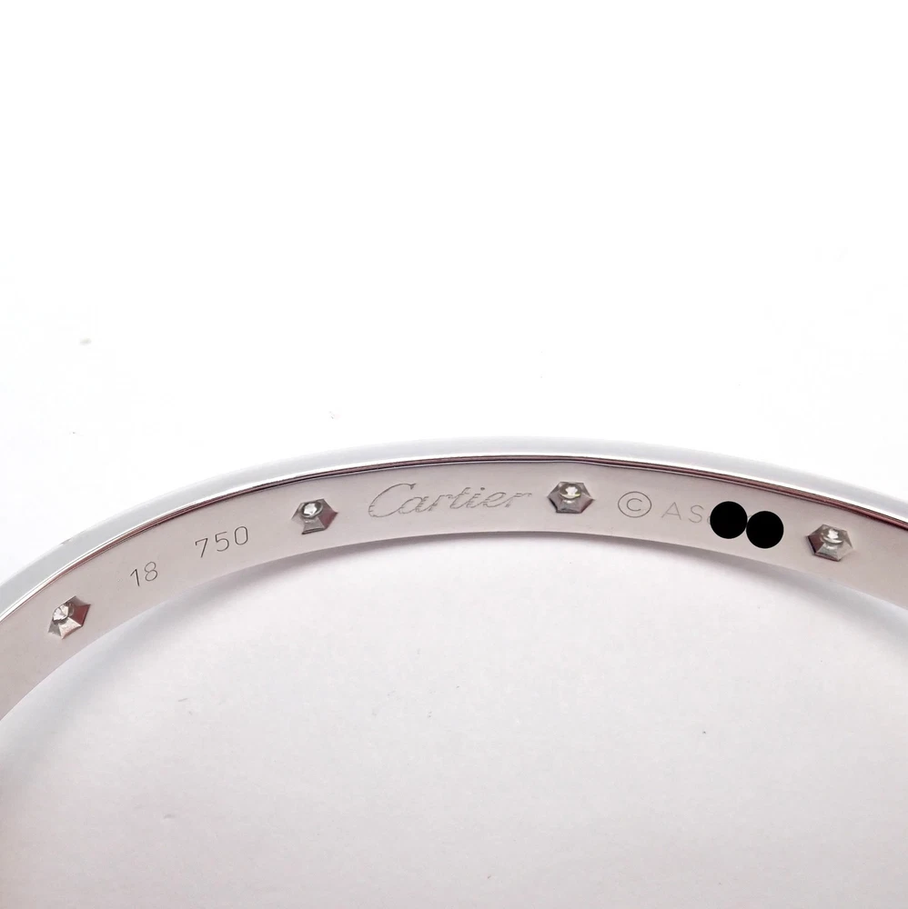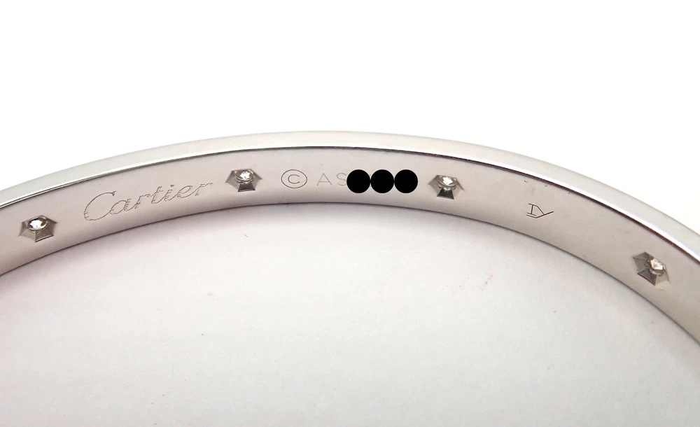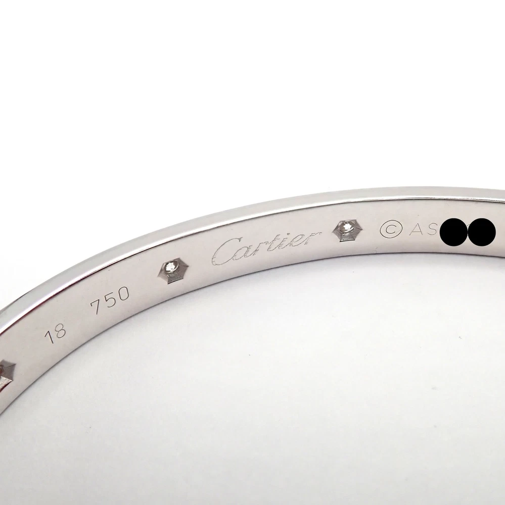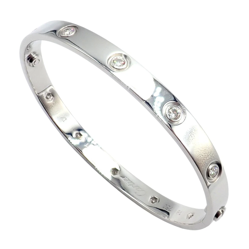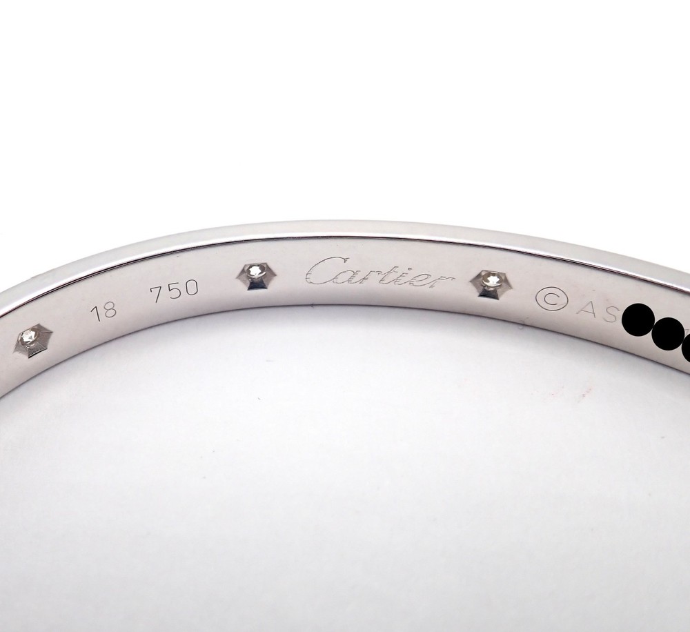 Authentic! Cartier Love 18k White Gold 10 Diamond Bangle Bracelet Sz 18 + Cert Welcome to Fortrove Payment / Shipping / Returns STORE HOME About Us NEW ARRIVALS ENDING SOON Add to Favorites FEEDBACK Contact Us Authentic! Cartier Love 18k White Gold 10 Diamond Bangle Bracelet Sz 18 + Cert Product Description About This Piece: This authentic Cartier Love Bangle, crafted in 18k white gold, features 10 brilliant-cut diamonds for timeless elegance. Iconic original Cartier diamonds where the screw motifs would be enhance its sleek, romantic design. Sized 18 and certified, it’s a symbol of enduring love and luxury, perfect for elevating any jewelry collection with refined sophistication. This bracelet comes with Cartier box & Cartier service paper. Old screw system. Retail Price: $18,300 Metal: 18k white gold Measurements: Size 18 Weight: Width: 32.8 grams 6.5mm Stones: 10x brilliant cut VS1 clarity, E color diamonds totaling 0.96 carats. Hallmarks: Cartier 750 18 AS6XXX(serial number omitted) Ti1122mmldd About Us Welcome to Fortrove, We have been providing fine estate and designer jewelry for over thirty-five years. We spent this time discovering treasures from all over the world. Originally located in Philadelphia on historic Jeweler's Row, Fortrove has expanded over the years and is now cultivated in the high end designer market to the world. We specialize in beautiful jewelry, handbags, and timepieces from around the globe. At Fortrove we believe that an artful piece of jewelry is a fine investment and wearable art. Now Fortrove is here to offer you a plethora of fine designer jewelry that is extraordinary in every way. From all of us to all of you at Fortrove. - Thank you and have an extraordinary day! Fortrove, Inc. Payment PayPal Payments Only. Buyer must have PayPal verified address. We accept Visa, MasterCard, Discover, and American Express via PayPal only. We charge 6% sales tax for sales in PA, this is applied at checkout. International Orders must pay by paypal with a high rating. Sorry No international credit cards. International law does not allow us to verify credit card holders valid address. Feel safe purchasing with FORTROVE Shipping World Wide shipping (excludes: Russia, Africa, and Indonesia) All international items are shipped via FedEx International which includes door to door tracking/signature and require phone number of destination. Returns *Returns are accepted for nearly any reason within 14 days. If you are not completely satisfied with your item please return to us for a full refund or an exchange. *Item must be in same condition as received Feedback Contact Us INFORMATION Fortrove Home Easy Payment Shipping info Returns policy FORTROVE New Arrivals Ending Soon Feedback Contact Us Newsletter Add Fortrove to your Favorites and receive my email newsletters about new items and special promotions! Subscribe Payment Options © Copyright 2023 Fortrove, Inc. All rights reserved.