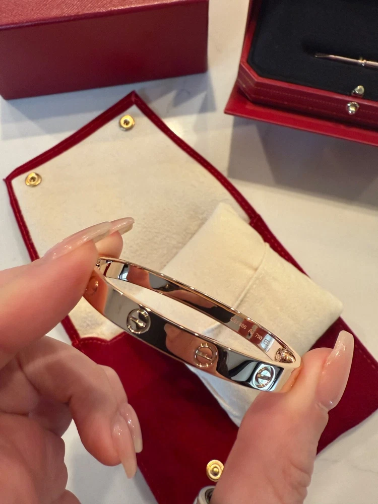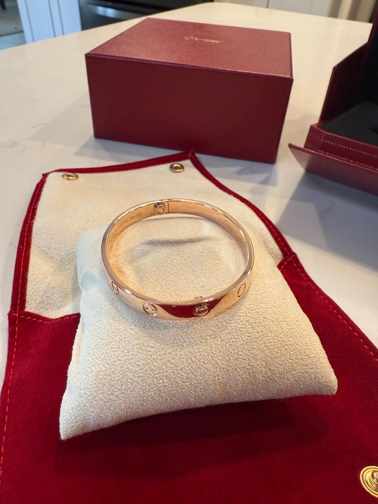 Cartier Love Bracelet, Rose Gold, 16cm, Classic Model Pre-owned, recently polished at the Houston boutique and has not been worn since. Looks like new. Purchase comes with box, travel case, original receipt, certificate of authenticity. Retails today for ~$8,000 including tax.