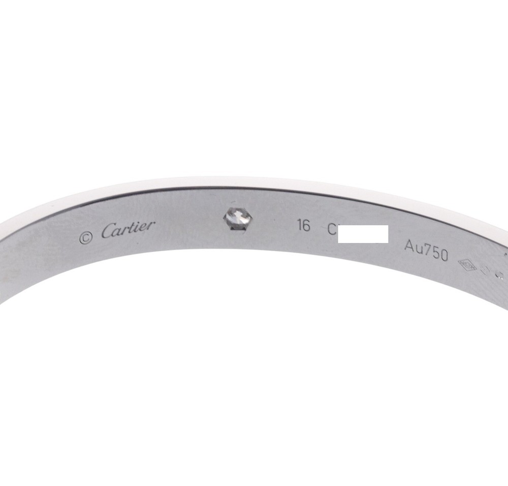 Cartier Love White Gold Diamond Bracelet Size 16 Comes with screw driver, COA and service paper. Retail $12700. MATERIAL 18k White Gold GEMSTONE Diamonds 0.42ctw CLARITY VS COLOR G DIMENSIONS Bracelet is Cartier size 16. MARKED or TESTED Cartier, 750, JCLN***. WEIGHT 30.9 grams StockOOYY8423 ALL ITEMS ARE GUARANTEED AUTHENTIC. ITEMS WILL ONLY BE SHIPPED TO THE ADDRESS SPECIFIED ON THE EBAY ORDER. PAYMENTS MUST BE RECEIVED WITHIN 4 DAYS FROM THE END OF AUCTION. PLEASE ASK QUESTIONS PRIOR TO COMMITTING TO PURCHASE. IF SPECIAL ARRANGEMENTS MUST BE MADE, PLEASE MESSAGE US! WE WILL TRY TO ACCOMMODATE YOU TO THE BEST OF OUR ABILITY.