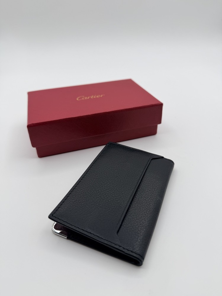 A refined essential from Must de Cartier, this vertical card holder is crafted in luxurious burgundy grained leather and features the iconic Cartier double “C” logo embossed on the front. Accented with elegant silver-tone metal corner guards, it offers a striking blend of heritage style and daily practicality. Details: • Cartier 4-Slot cardholder • Color: Black • Grained calfskin leather exterior and interior • Embossed interlocking Cartier logo on the front • Four interior card slots + one central slip compartment • Rear exterior slip pocket for quick access • Silver-tone corner protectors for a signature finish • Stamped Cartier – Made in Italy • Includes original Cartier box, dust bag, booklet, and care card • Approx. dimensions: 4.3 in x 3 in (11cm x 7.5cm)