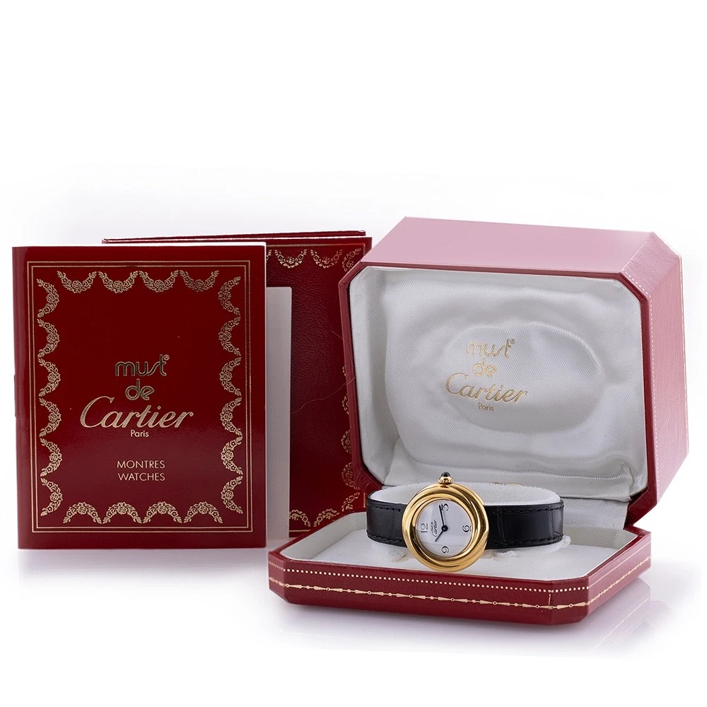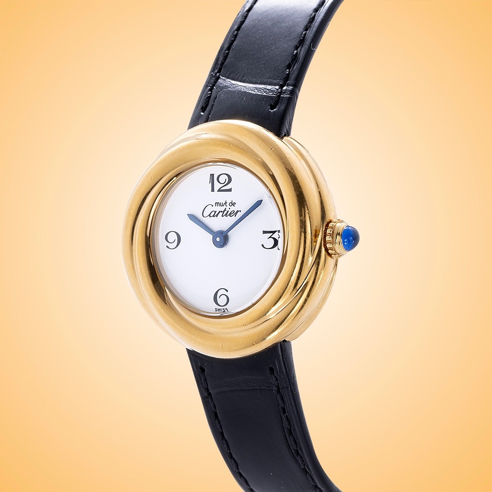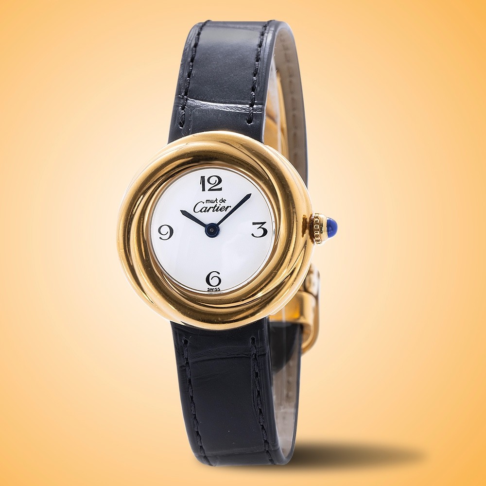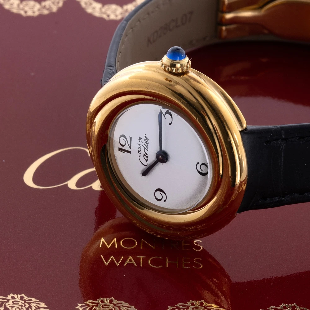 Essence of Time Cartier Must de Cartier Trinity Quartz Gold-Plated Vintage Ladies Watch 2735 Description: Cartier—the very name itself evokes the pinnacle of sumptuous luxury goods. One look at this stunning vintage timepiece and you may think, It’s a must-have for my collection. In fact, you would not be alone in this line of thinking. Must de Cartier, meaning Cartier, it’s a must was a fascinating line of watches named in celebration of the English phrase, a must have. First, the 925 silver base metal case with attractive yellow gold plating moves the eye in its dynamic and thoroughly unique swirling shape. It measures a comfortable 27 mm in diameter and 6.5 mm in height. The gold-plated deployant buckle adds a layer of safety while resting upon a brand new black matte-finish alligator leather strap. Note the push / pull winding crown that has been thoughtfully emblazoned with an eye-catching blue cabochon. Upon the clean white dial we encounter 4 printed Arabic numerals and sword-shaped blued steel hands Additional features include a scratch-resistant sapphire crystal, a push / pull winding crown with ridges on the side for easier turning, and slightly domed sapphire crystal. A minimalist masterpiece in every regard, this Cartier Must de Cartier Trinity timepiece will surely make an outstanding addition to your collection. Standout features: Unique 925 silver base metal case with attractive gold plating; gold-plated deployant buckle; cabochon-emblazoned winding crown. Details at a glance: Model Reference: 2735 Case Material: 925 Silver base metal with gold plating Case Dimensions: 27 mm Case Height: 6.5 mm Movement: Quartz Caliber: Cartier 157 Complication(s) / Feature(s): Standard time Dial: White with printed Arabic numerals Crystal: Domed scratch-resistant sapphire Winding Crown: Push / pull Water-resistance: 20 m / 2 atm Band: Black alligator semi-matte leather strap Clasp: Stainless steel gold-plated deployant buckle Country of Origin: Switzerland Condition: Pre-owned in good vintage condition; the watch has been cleaned, comes with fresh battery and was tested for water-resistance up to 20 m / 2 atm. New OEM black alligator leather strap has been installed. Comments: Includes original box and booklet Auction and Payment Procedures: We welcome all interested eBay watch shoppers to participate in our auctions and have highly valued continuous support from eBay's community. We would like to offer our Products , Experience and High Service Level to all eBay members – Domestic and International , Experienced Shoppers and Novices alike. A winning bidder needs to contact us within 3 (three) days after the auction's successful purchase according to eBays' and our rules and policies to make all necessary payment arrangements. The payment has to be received within ten days after the auction's closing. We encourage our potential eBay customers to contact us with all vital questions regarding our merchandising, payment procedures, shipping, etc. prior or during active auctions, so we could make your shopping and trading experience with us as pleasant as possible . A Winning Bid is a legal binding contract between buyer and seller per eBay Rules and Regulations, and transactions must be fulfilled according to these policies. Domestic Shipping: Shipments are performed via fully insured Next Day or 2nd Day UPS Delivery service, and the shipping charges are based on the insured amount and urgency of the shipment. All packages are shipped with "Signature Required" for customer's security and have to be signed for by an authorized adult. We can make certain shipping accommodations by using different shipping couriers and ask potential customers to contact us with their inquiries. International Shipping: We ship our watches Worldwide and have extensive experience in international shipments. Our international deliveries are performed via fully insured International Priority FedEx service. We encourage our International bidders to contact us for shipping quotes to the countries of their residence since shipping charges vary quite significantly depending on geographic regions of the world. Please note, that all International customers are responsible for VAT, any associated taxes, customs fees imposed and charged by their local governments. Warranty Policies: Essence of Time, Inc. provides a Warranty of 2 Years on brand new, unworn watches, a 1-Year Warranty on pre-owned certified watches , and 9 0-Days mechanical warranty on vintage timepieces from the date of purchase. If a problem with the watch occurs during this period, customers need to contact us and request our Authorization to return the watch for repairs. We keep our customers updated on a status of repairs, and once a watch is fixed, customer will be notified and the watch will be shipped back. Our warranty doesn't cover damages caused by excessive wear and tear, scratches on the case and crystals, non-compliance with manufacturer’s specifications in operating the watch, water-resistance limitations and physical abuse. Returns: We offer 14-Days Return Policy on our watches from the date of receipt of the watch. A customer needs to notify us by the end of a 14th Day of his / her intentions to return a watch, and it has to be shipped back to us as soon as possible. Please don't wear a watch until you are certain, that you would like to keep it. All watches must be returned in the same condition to qualify for refund as they were received, including all boxes, papers, hand tags and other accessories included with a watch. The customer is responsible for return shipping and insurance costs when sending a watch back to us. We reserve the right to reject any returns and withhold the refund if a watch was tempered with, worn, damaged, scratched or altered in any way . General Information About Us: We specialize in high-end Brand Name new and pre-owned timepieces from the most recent and current productions manufactured by leading Swiss 
