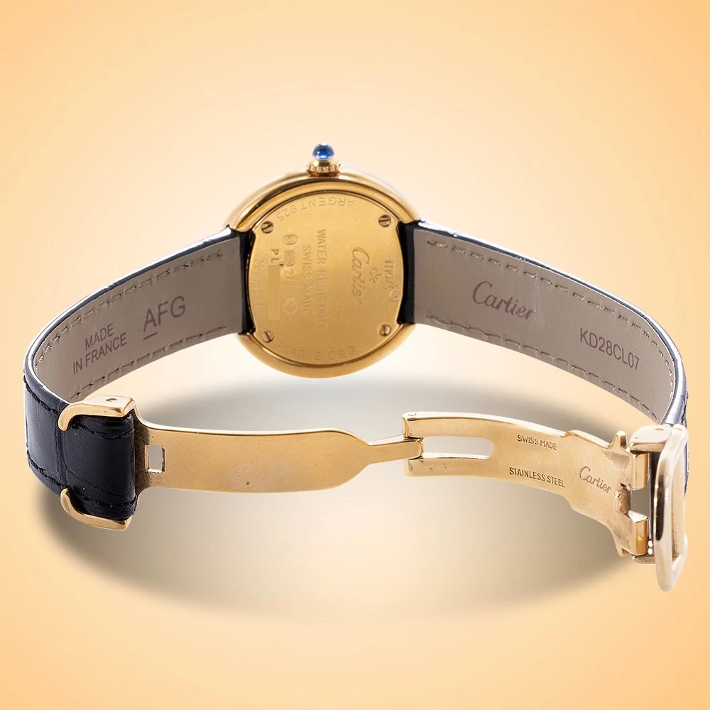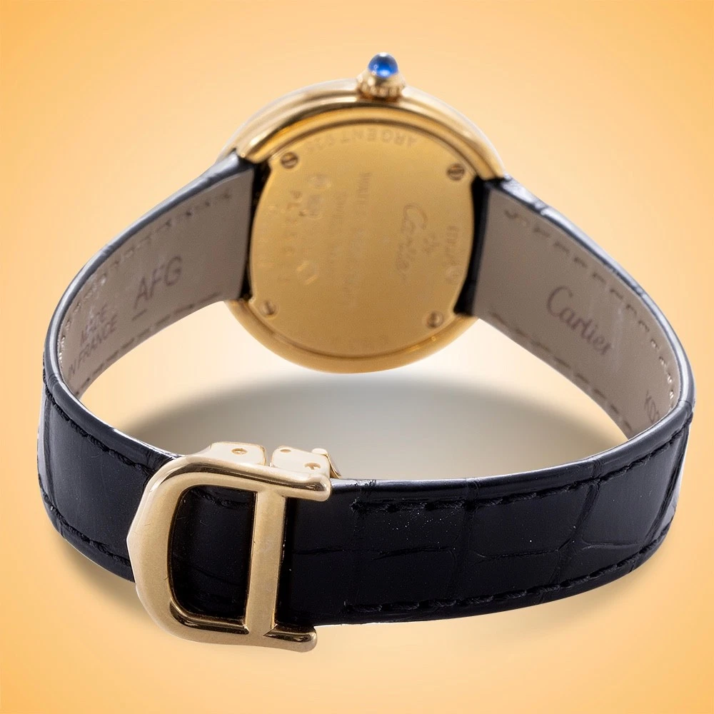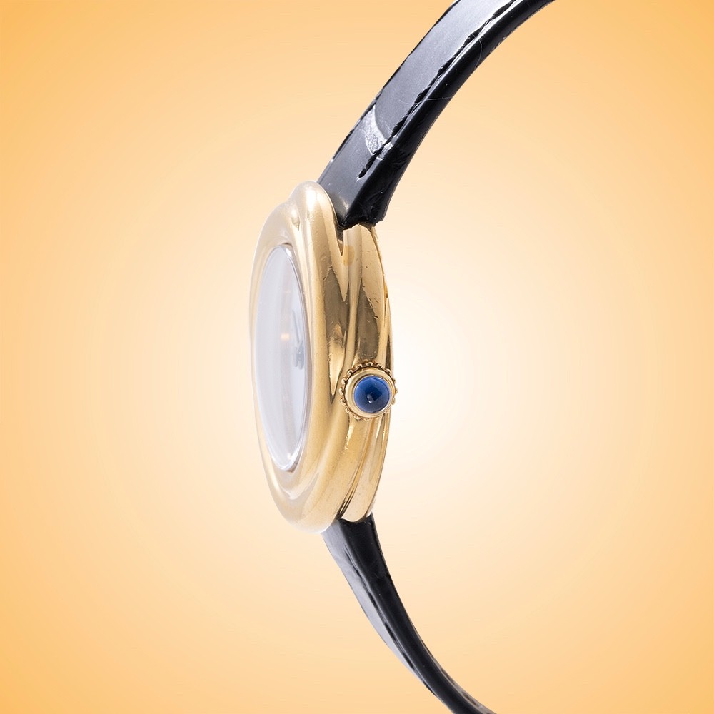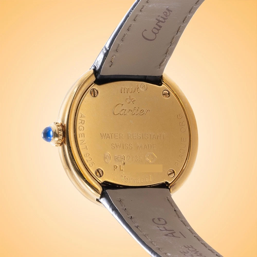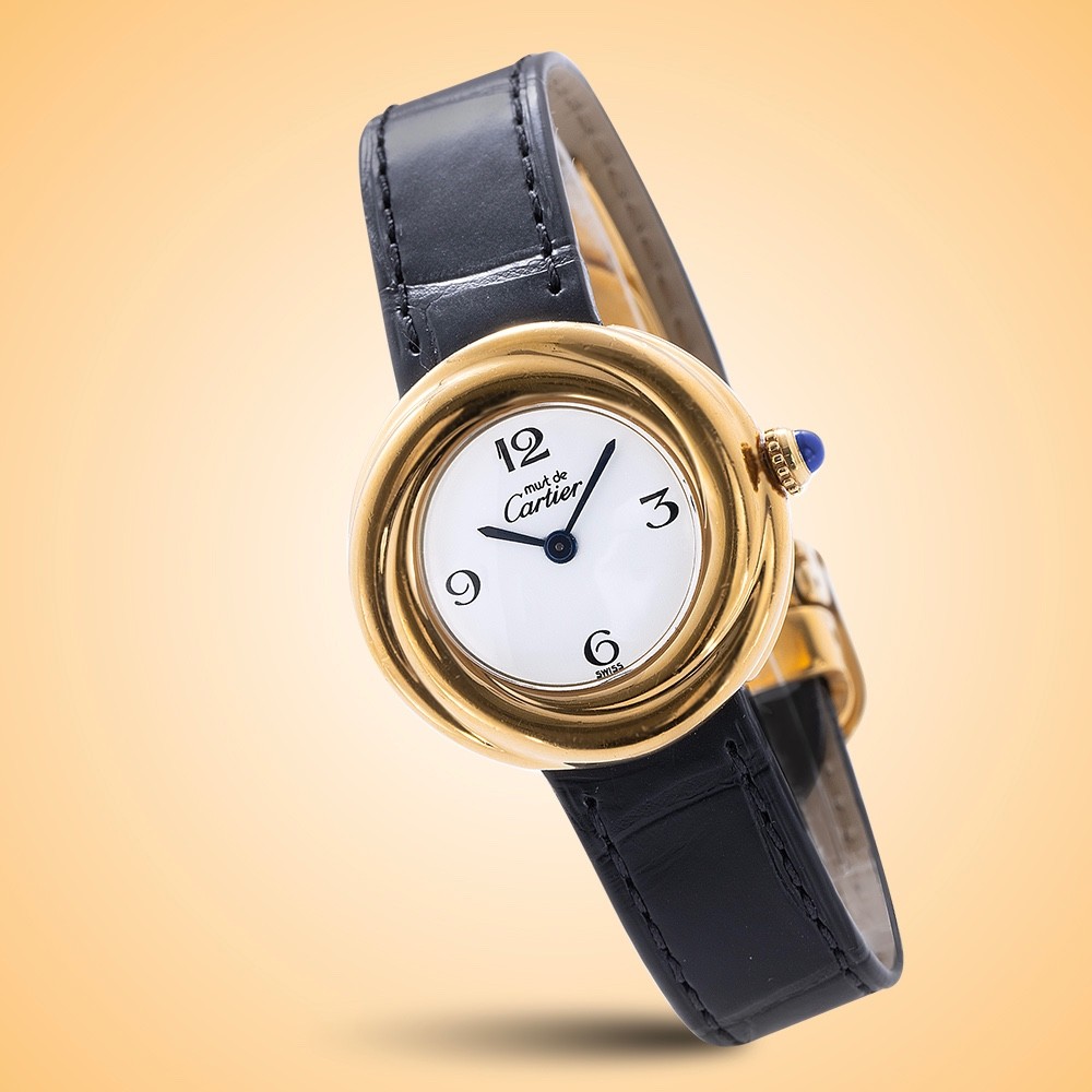 Essence of Time Cartier Must de Cartier Trinity Quartz Gold-Plated Vintage Ladies Watch 2735 Description: Cartier—the very name itself evokes the pinnacle of sumptuous luxury goods. One look at this stunning vintage timepiece and you may think, It’s a must-have for my collection. In fact, you would not be alone in this line of thinking. Must de Cartier, meaning Cartier, it’s a must was a fascinating line of watches named in celebration of the English phrase, a must have. First, the 925 silver base metal case with attractive yellow gold plating moves the eye in its dynamic and thoroughly unique swirling shape. It measures a comfortable 27 mm in diameter and 6.5 mm in height. The gold-plated deployant buckle adds a layer of safety while resting upon a brand new black matte-finish alligator leather strap. Note the push / pull winding crown that has been thoughtfully emblazoned with an eye-catching blue cabochon. Upon the clean white dial we encounter 4 printed Arabic numerals and sword-shaped blued steel hands Additional features include a scratch-resistant sapphire crystal, a push / pull winding crown with ridges on the side for easier turning, and slightly domed sapphire crystal. A minimalist masterpiece in every regard, this Cartier Must de Cartier Trinity timepiece will surely make an outstanding addition to your collection. Standout features: Unique 925 silver base metal case with attractive gold plating; gold-plated deployant buckle; cabochon-emblazoned winding crown. Details at a glance: Model Reference: 2735 Case Material: 925 Silver base metal with gold plating Case Dimensions: 27 mm Case Height: 6.5 mm Movement: Quartz Caliber: Cartier 157 Complication(s) / Feature(s): Standard time Dial: White with printed Arabic numerals Crystal: Domed scratch-resistant sapphire Winding Crown: Push / pull Water-resistance: 20 m / 2 atm Band: Black alligator semi-matte leather strap Clasp: Stainless steel gold-plated deployant buckle Country of Origin: Switzerland Condition: Pre-owned in good vintage condition; the watch has been cleaned, comes with fresh battery and was tested for water-resistance up to 20 m / 2 atm. New OEM black alligator leather strap has been installed. Comments: Includes original box and booklet Auction and Payment Procedures: We welcome all interested eBay watch shoppers to participate in our auctions and have highly valued continuous support from eBay's community. We would like to offer our Products , Experience and High Service Level to all eBay members – Domestic and International , Experienced Shoppers and Novices alike. A winning bidder needs to contact us within 3 (three) days after the auction's successful purchase according to eBays' and our rules and policies to make all necessary payment arrangements. The payment has to be received within ten days after the auction's closing. We encourage our potential eBay customers to contact us with all vital questions regarding our merchandising, payment procedures, shipping, etc. prior or during active auctions, so we could make your shopping and trading experience with us as pleasant as possible . A Winning Bid is a legal binding contract between buyer and seller per eBay Rules and Regulations, and transactions must be fulfilled according to these policies. Domestic Shipping: Shipments are performed via fully insured Next Day or 2nd Day UPS Delivery service, and the shipping charges are based on the insured amount and urgency of the shipment. All packages are shipped with "Signature Required" for customer's security and have to be signed for by an authorized adult. We can make certain shipping accommodations by using different shipping couriers and ask potential customers to contact us with their inquiries. International Shipping: We ship our watches Worldwide and have extensive experience in international shipments. Our international deliveries are performed via fully insured International Priority FedEx service. We encourage our International bidders to contact us for shipping quotes to the countries of their residence since shipping charges vary quite significantly depending on geographic regions of the world. Please note, that all International customers are responsible for VAT, any associated taxes, customs fees imposed and charged by their local governments. Warranty Policies: Essence of Time, Inc. provides a Warranty of 2 Years on brand new, unworn watches, a 1-Year Warranty on pre-owned certified watches , and 9 0-Days mechanical warranty on vintage timepieces from the date of purchase. If a problem with the watch occurs during this period, customers need to contact us and request our Authorization to return the watch for repairs. We keep our customers updated on a status of repairs, and once a watch is fixed, customer will be notified and the watch will be shipped back. Our warranty doesn't cover damages caused by excessive wear and tear, scratches on the case and crystals, non-compliance with manufacturer’s specifications in operating the watch, water-resistance limitations and physical abuse. Returns: We offer 14-Days Return Policy on our watches from the date of receipt of the watch. A customer needs to notify us by the end of a 14th Day of his / her intentions to return a watch, and it has to be shipped back to us as soon as possible. Please don't wear a watch until you are certain, that you would like to keep it. All watches must be returned in the same condition to qualify for refund as they were received, including all boxes, papers, hand tags and other accessories included with a watch. The customer is responsible for return shipping and insurance costs when sending a watch back to us. We reserve the right to reject any returns and withhold the refund if a watch was tempered with, worn, damaged, scratched or altered in any way . General Information About Us: We specialize in high-end Brand Name new and pre-owned timepieces from the most recent and current productions manufactured by leading Swiss 