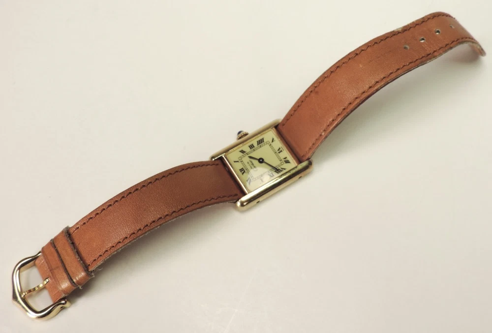 BRAND: CARTIER ITEM: LADIE'S TANK WATCH SERIES: LE MUST DE CARTIER ITEM: WRISTWATCH SIZE: OVERALL CASE MEASUREMENT IS APPROX. 27MM X 20MM MODEL: LES MUST DE CARTIER STYLE: TANK COLORING: CREME FACE BAND: TAN LEATHER INCLUDED: "REPRESENTANTS AGREES" BOOKLET, GUARANTEE, GUARANTEE CARD, CARD CASE (SORRY, NO ORIGINAL BOX) MOVEMENT: MECHANICAL