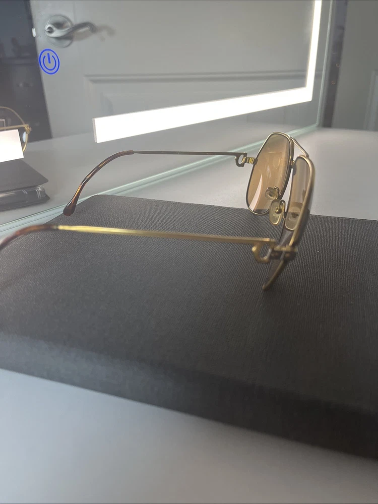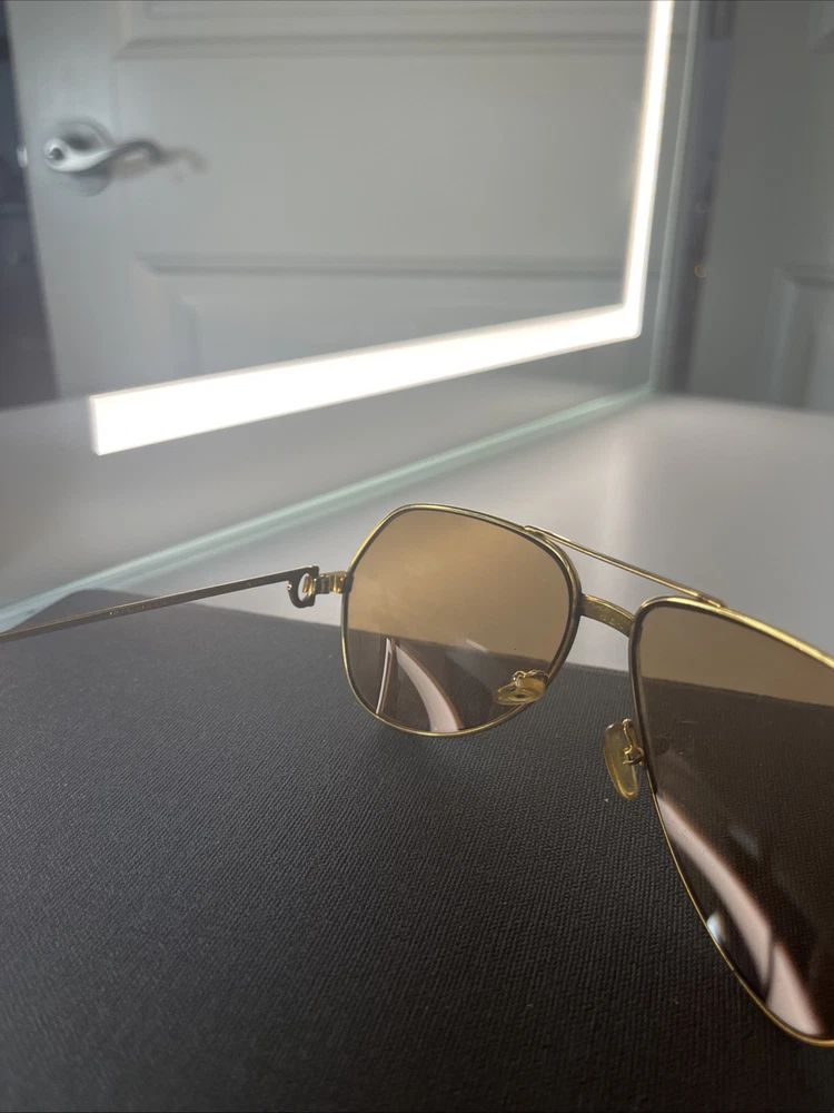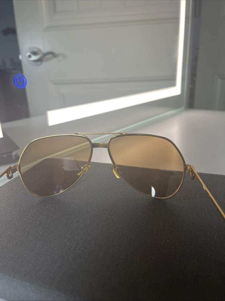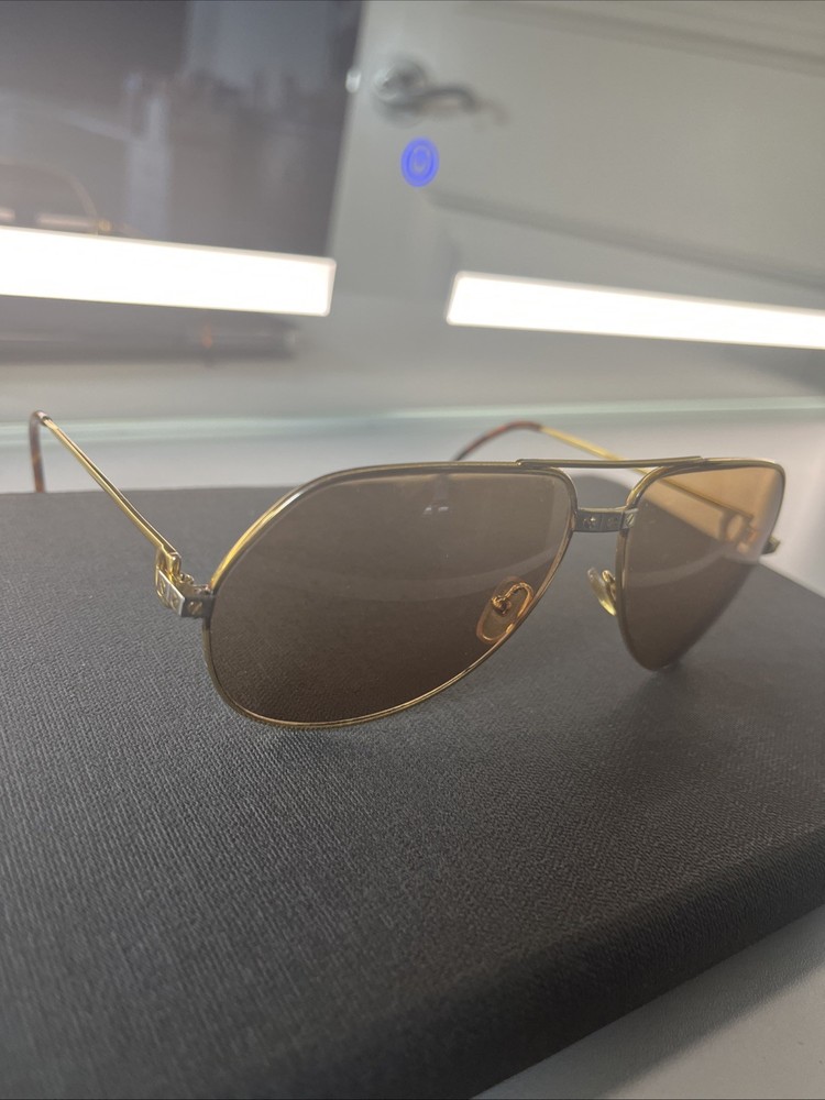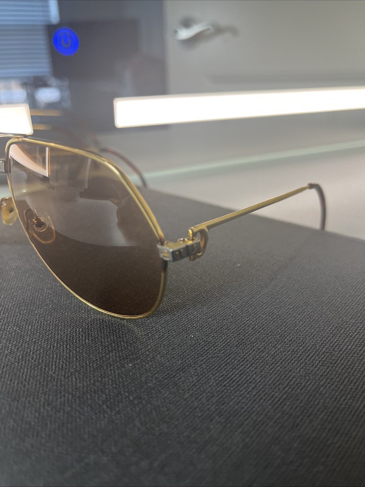 The Cartier Vintage Sunglasses are classic aviator-style sunglasses with a gold metal frame and tinted polycarbonate lenses offering UV400 protection. These timeless sunglasses feature a solid pattern, a magnification strength of 1, and a vintage appeal that makes them a stylish accessory for both men and women. The brand's reputation for quality craftsmanship is reflected in the durable construction and unique design of these sunglasses. Perfect for adding a touch of luxury to any outfit, these Cartier sunglasses are a must-have for anyone looking to make a statement. These Glasses are used and have a little bit os scratches on lenses but other then that there in good shape . No Cartier Box sorry