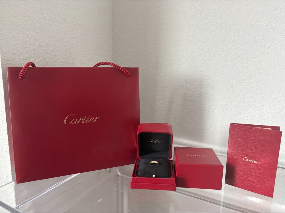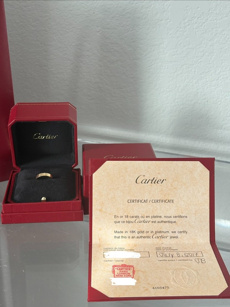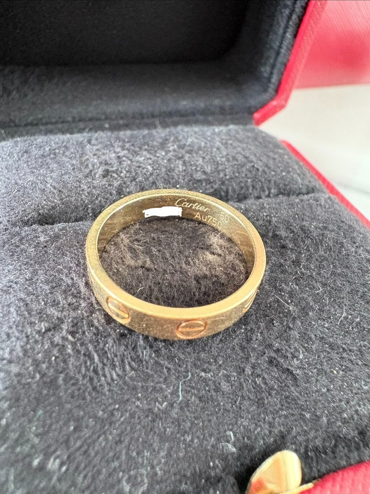 Authentic Cartier Love Ring Size 50 in good condition with regular wear and scratches expected in a pre owned item. Comes with Cartier bag, box, and authenticity certificate. Can share a pic of receipt and the item number if needed. This ring is 3.6mm wide.