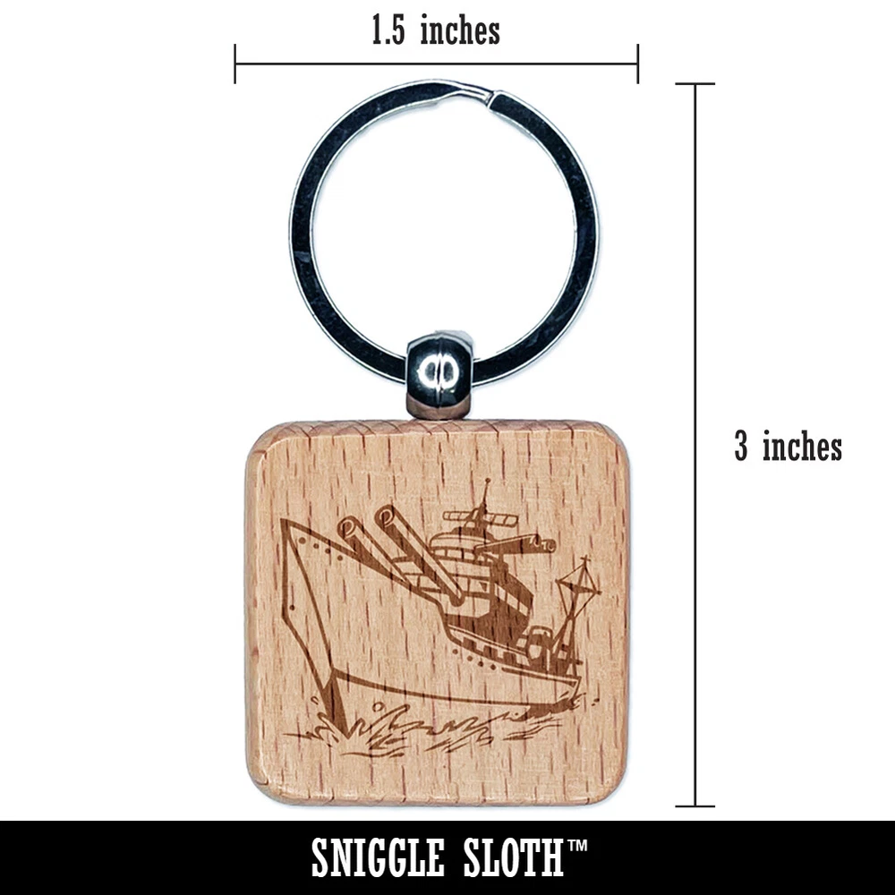 Cartoon Navy Battleship Engraved Wood Square Keychain Tag Charm