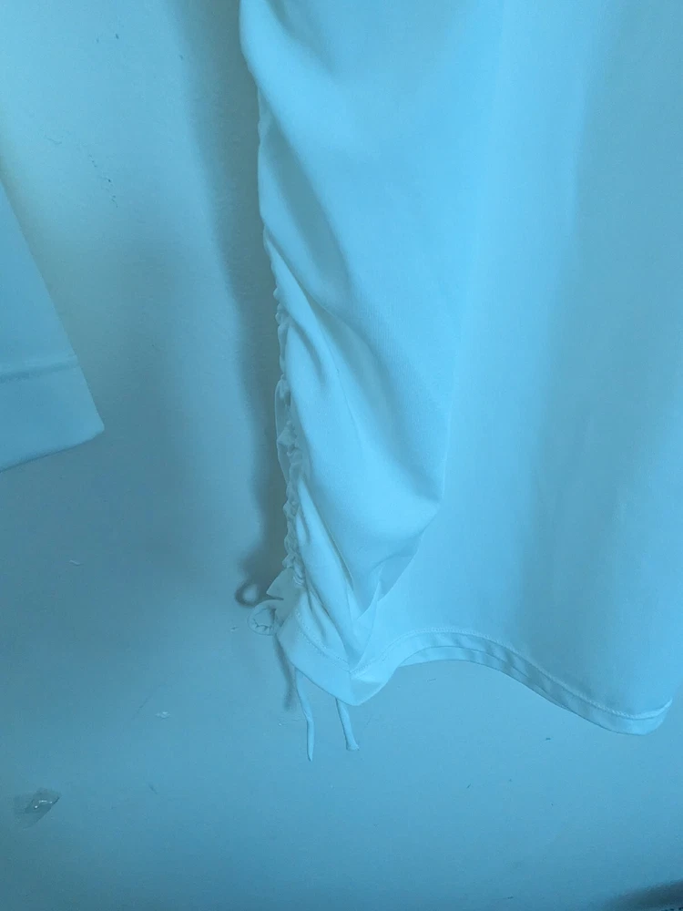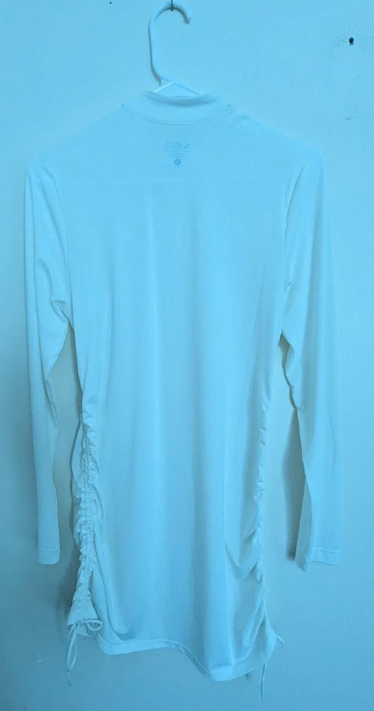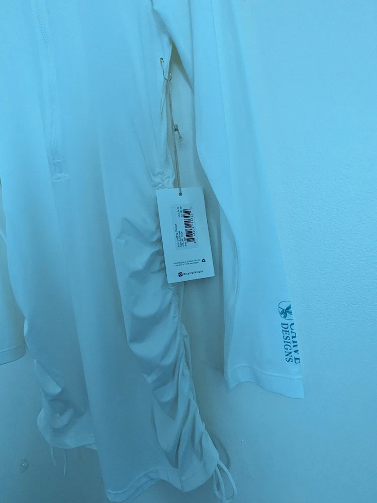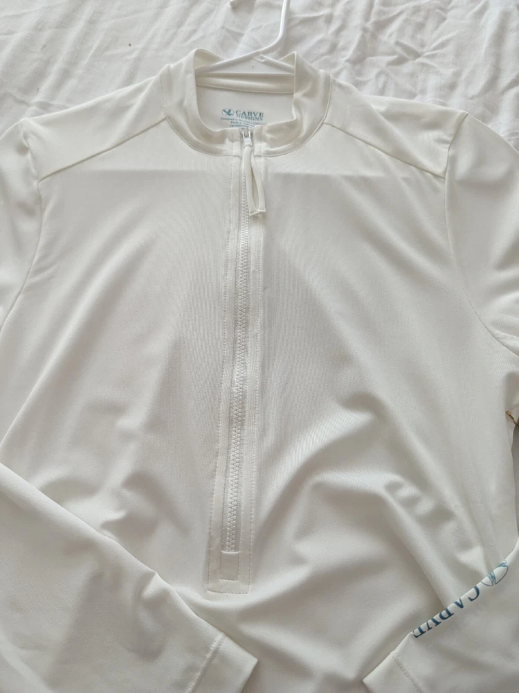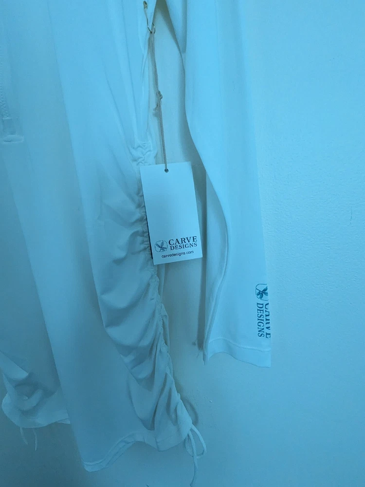 This Carve Designs rashguard top is perfect for women who want to stay safe while they enjoy the beach or surf. The top comes in a size small, with a solid white color and a half-zip design. It is made from a combination of recycled polyester and spandex, and features ruched sides and a Carve Designs logo on sleeve accent. The shirt is designed with a swim shirt style, and has long sleeves for added comfort. It is recommended to hand wash the shirt only. The top is perfect for those who want a designer, yet stylish and functional piece of clothing. It is suitable for sports and other beach activities. Measurements in photos