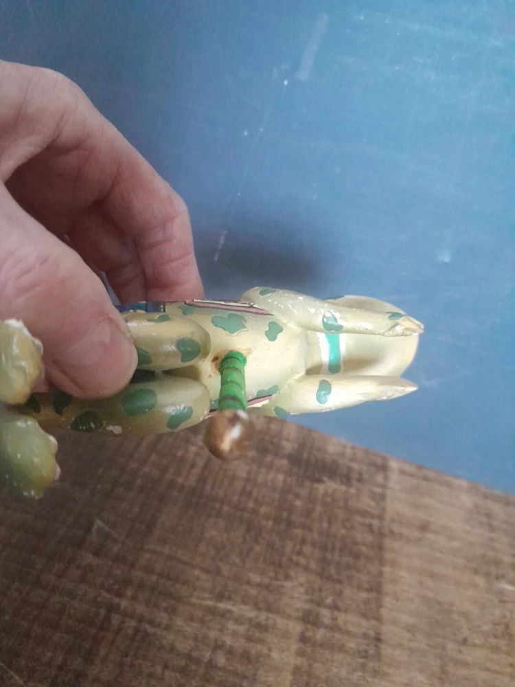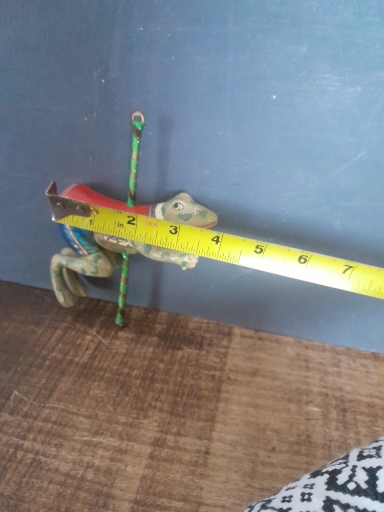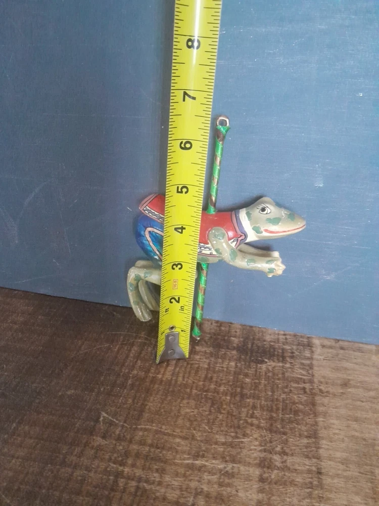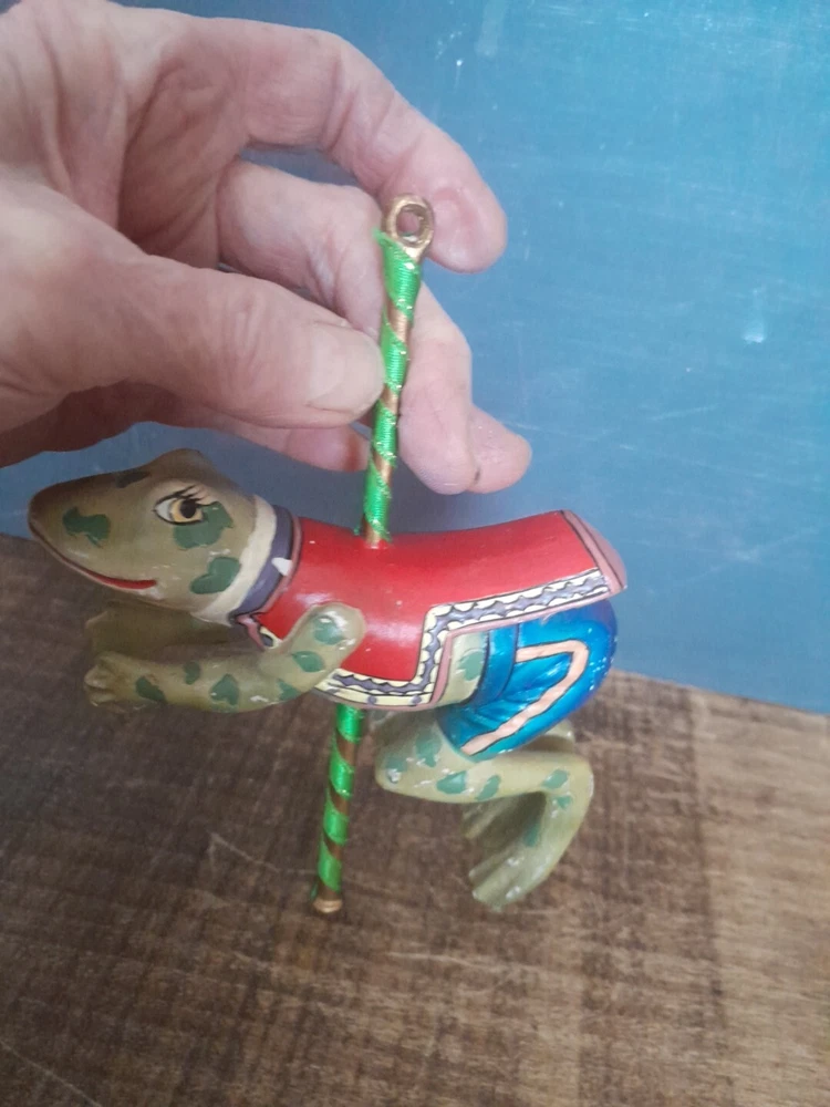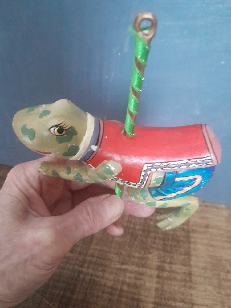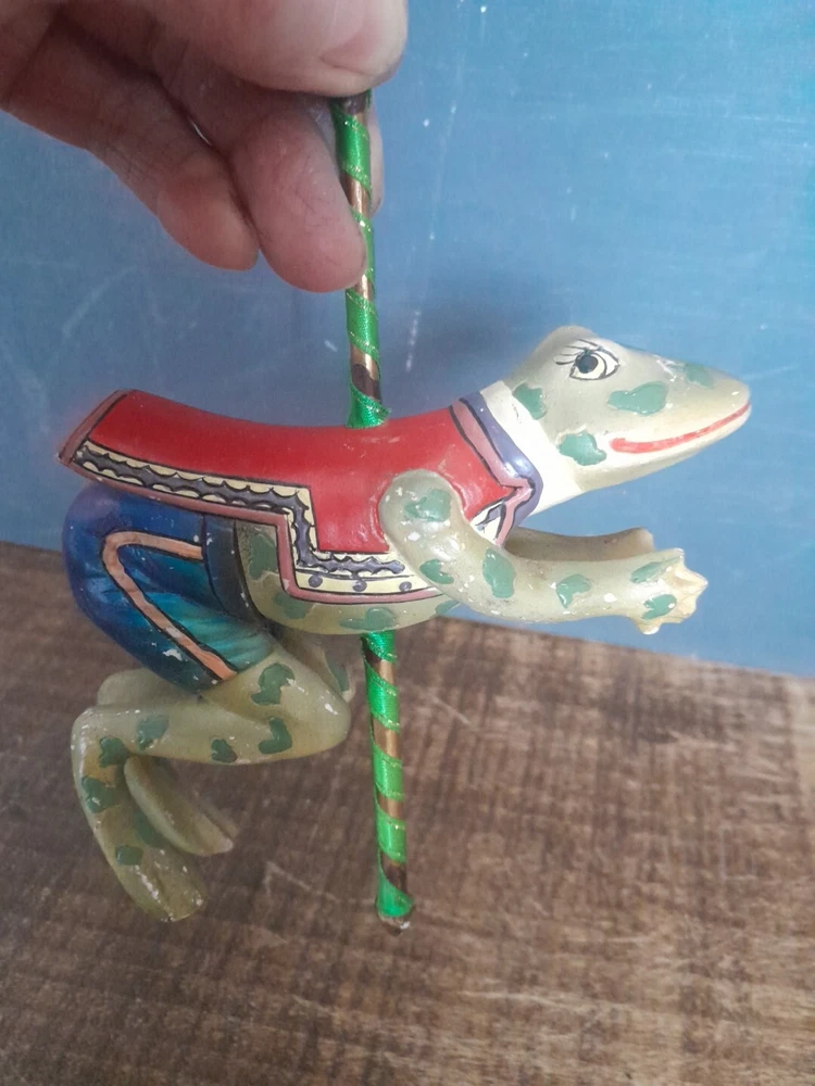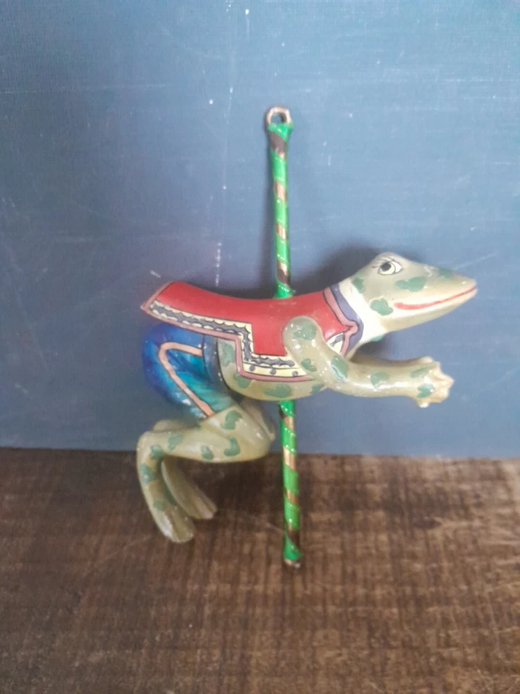 The Kurt Adler ornament is a vintage hand-painted wooden and resin carousel ornament featuring a frog design from The Smithsonian Institution collection. It is a unique addition to any Christmas ornament collection. Very minor wear on paint wear from age please see pictures for part of description and measurements any questions please ask thank you