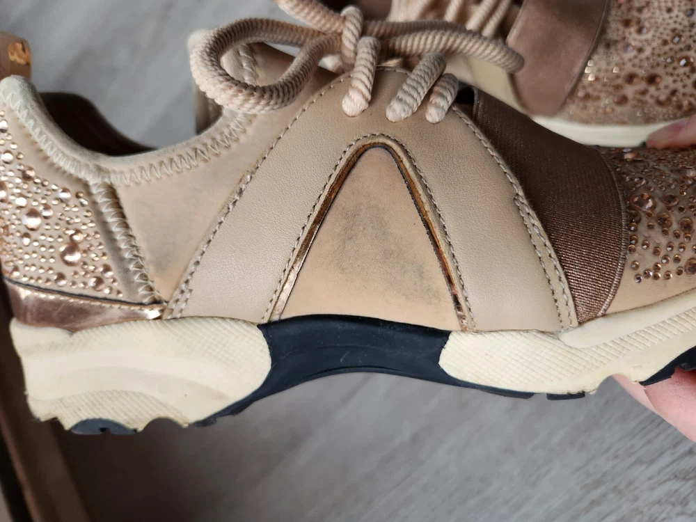 Step up your shoe game with these gorgeous Carvela rose gold sneakers! These stunners are perfect for a day out on the town or hitting the club with your friends. The metal cleats give them an athletic edge, while the studded accents add a touch of punk rock flair. Some wear and tare see pictures