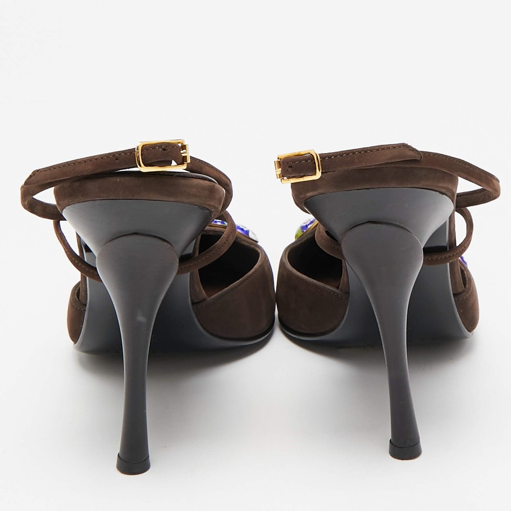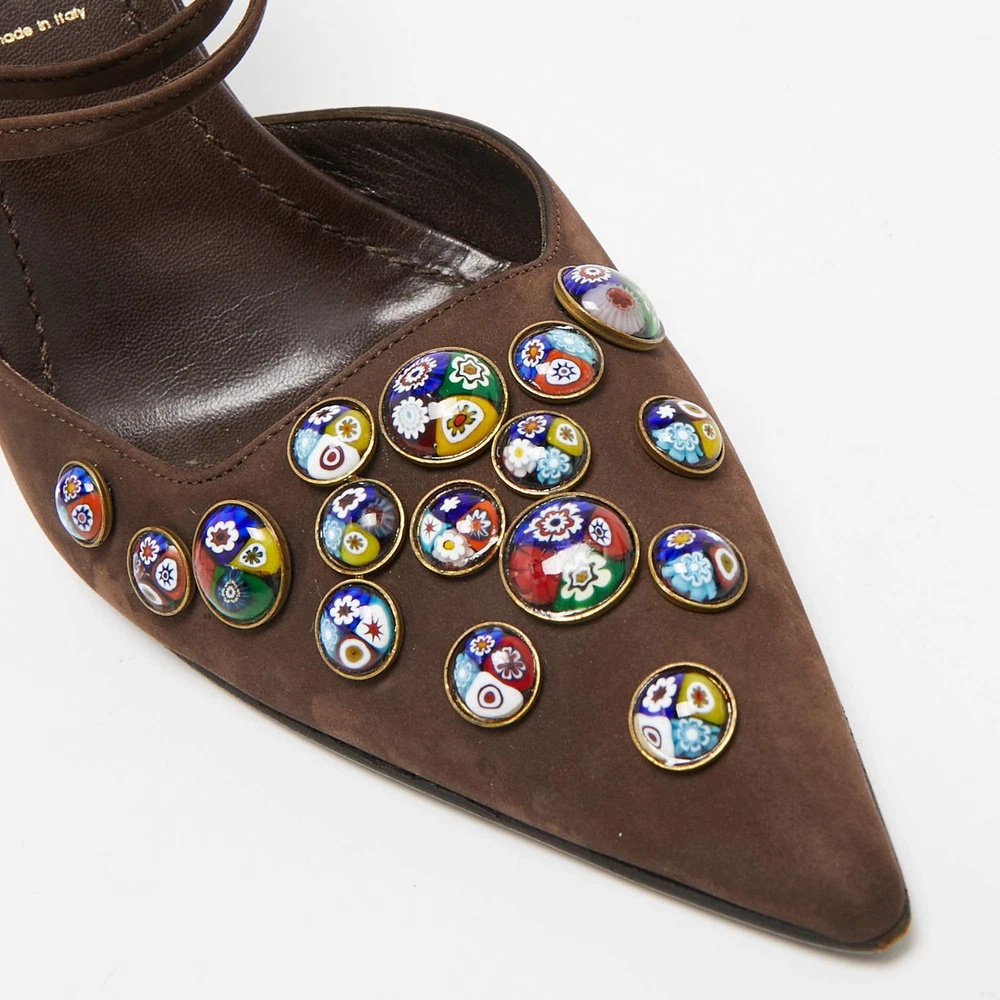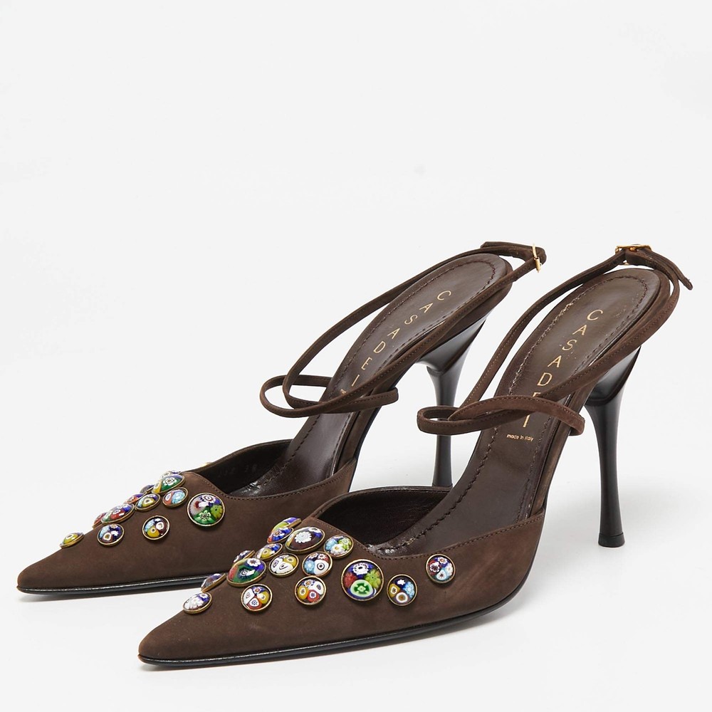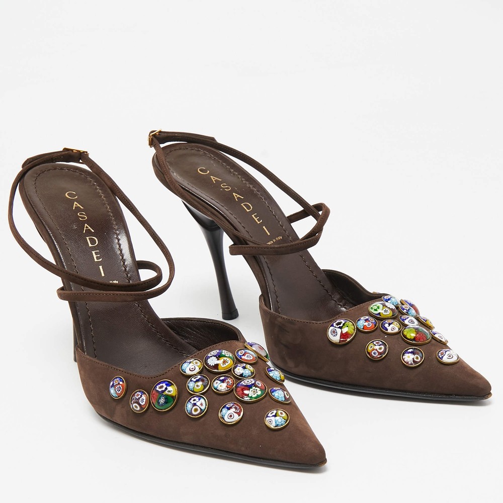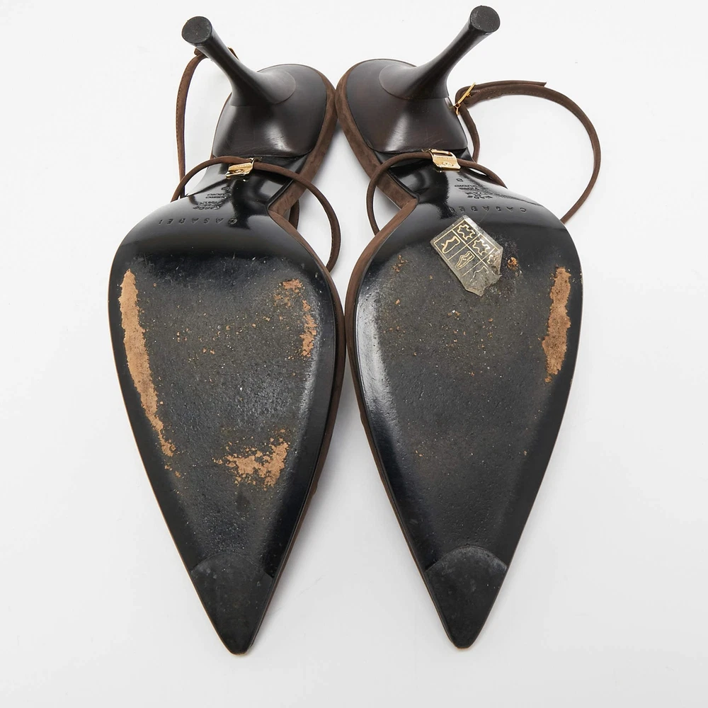 Our eBay Store About Us Contact Us Add to Favorite Sellers Casadei Dark Brown Nubuck Leather Pointed Toe Ankle Wrap Sandals Size 38 Gorgeous details and an understated elegance crowns these Casadei sandals. The dark brown nubuck leather construction brings to life a pointed-toe silhouette that is enhanced by chic motifs on vamps and buckled ankle wraps. Set on 11cm heels, these beauties will offer you a comfortable walk with their leather-lined insoles. They'll match well with a lot of outfits! Product Details Brand Casadei Color Brown Includes Original Dustbag Outsole Length 26 cm Outsole Width 8 cm Size US 8 (EU 38/UK 5) Certified by The Luxury Closet This item has gone through a detailed authentication process overseen by our experts. We offer a lifetime guarantee of authenticity on all our items. How We Check The in-house team of experts at The Luxury Closet is highly trained to verify the authenticity and the condition of the luxury products. They ensure that only 100% authentic items are put on sale.The evaluation process is unique with its own mix of assessment criteria and differs according to the category. Each item is evaluated based on the following combination of hallmarks, hardware, stitching, symmetry, material, craftsmanship, stamping, codes, hologram stickers, and packaging. Our authenticators also check if the items have been modified or amended (e.g., aftermarket diamonds, replaced batteries, repaired bags, etc.) International Buyers Import duties, taxes and charges are not included in the item price. These charges are the buyers responsibility. Please check with your country’s customs office to determine what these additional cost will be prior to buying.