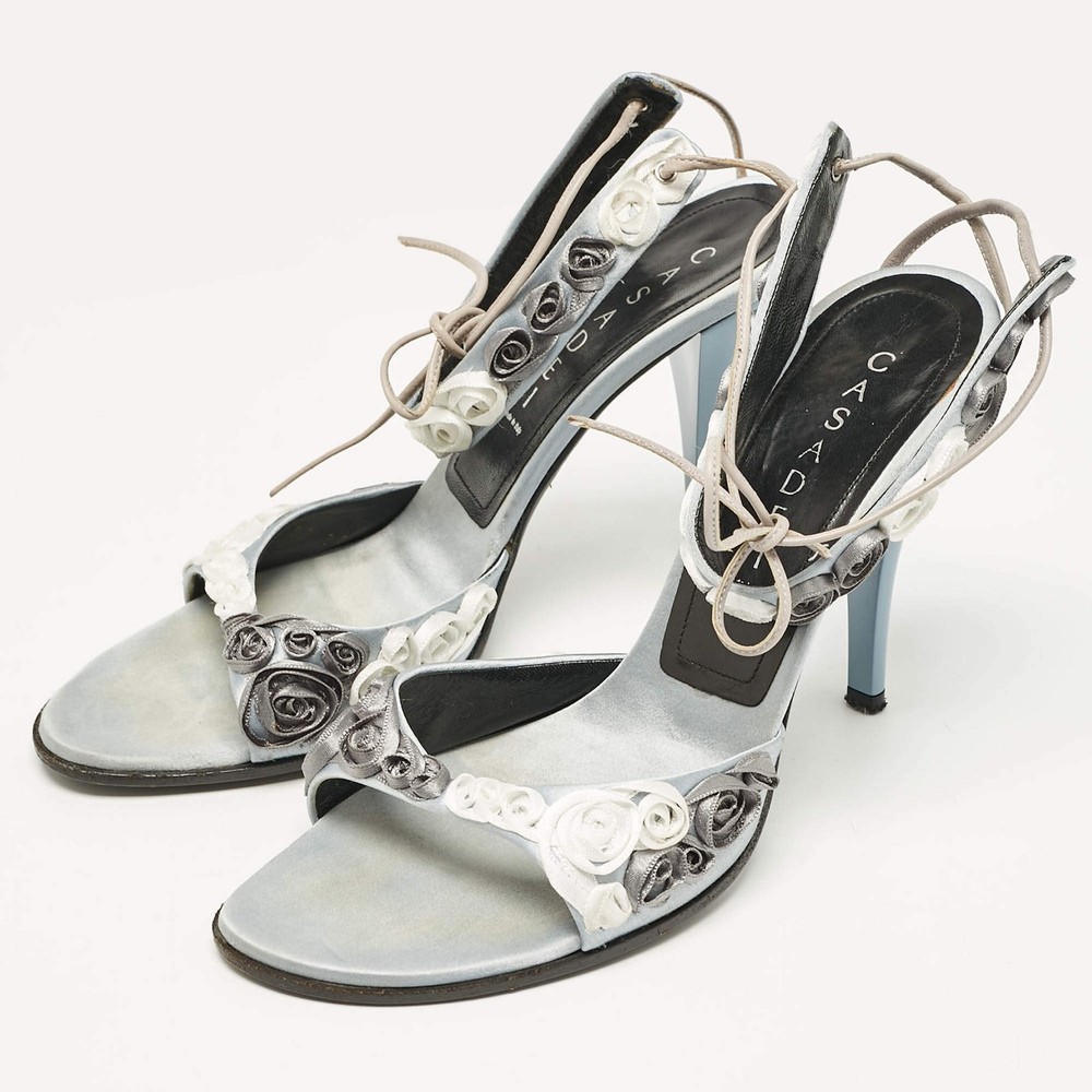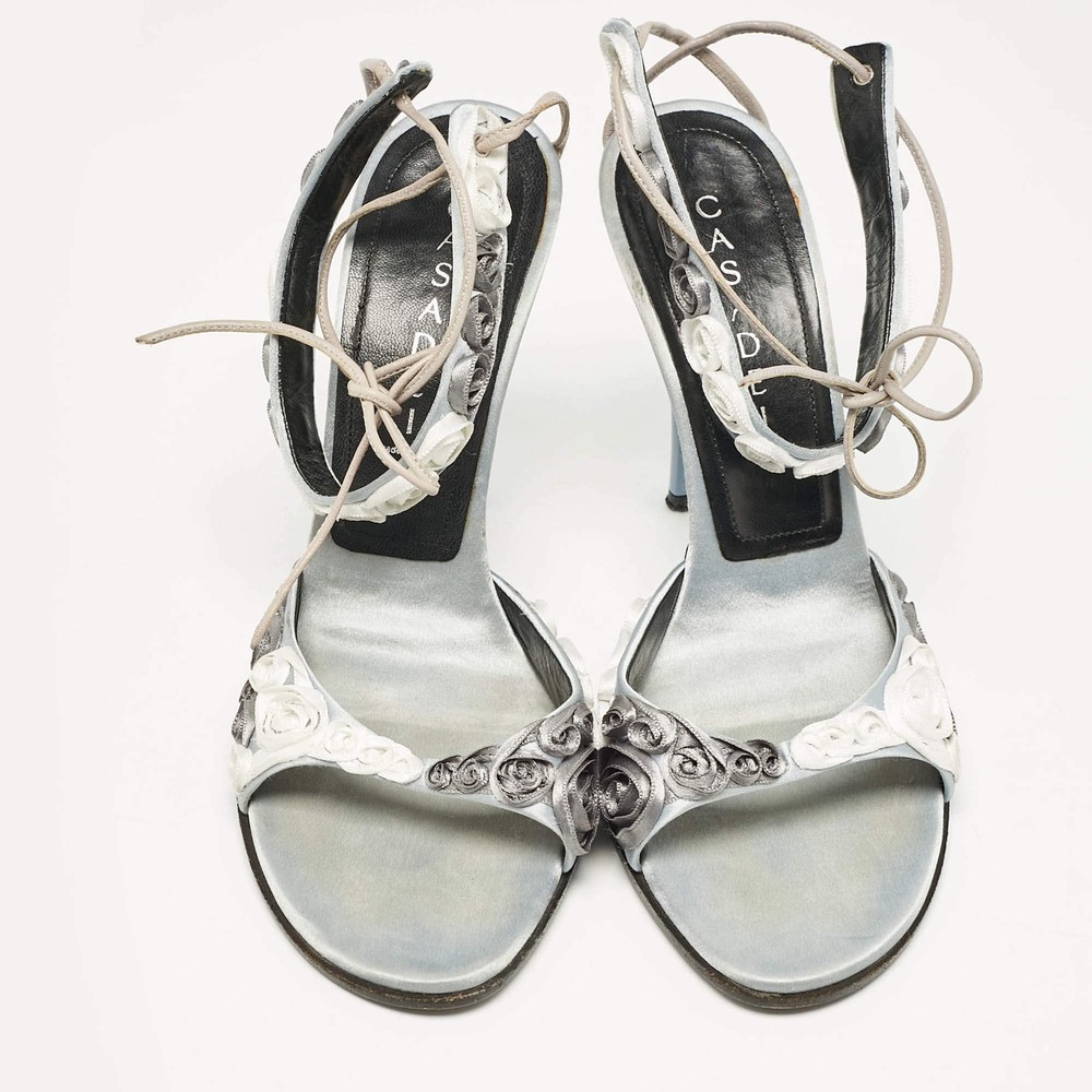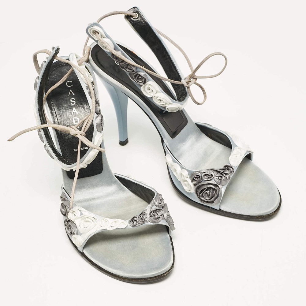 Casadei Grey Satin Floral Ankle Tie Up Sandals Size 38