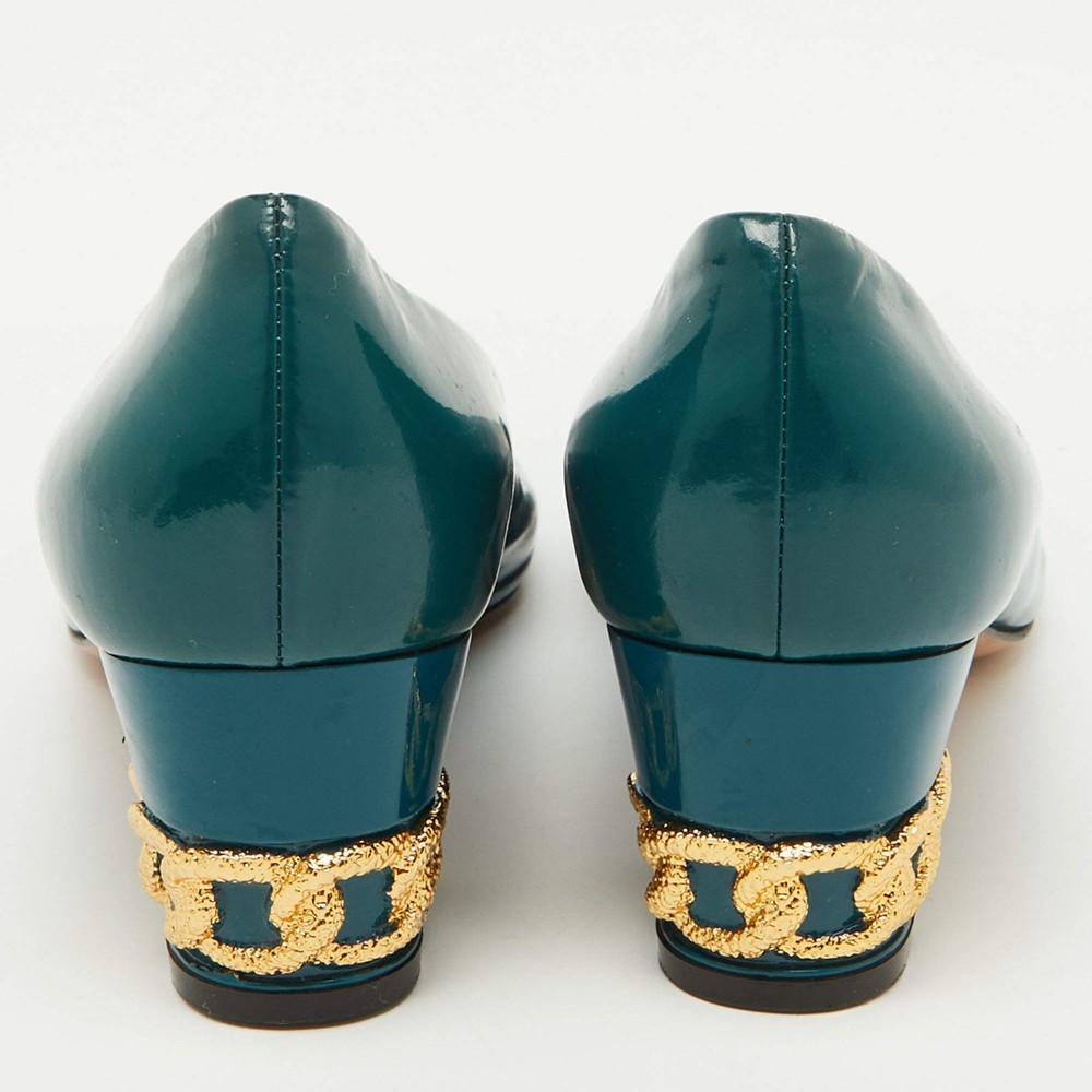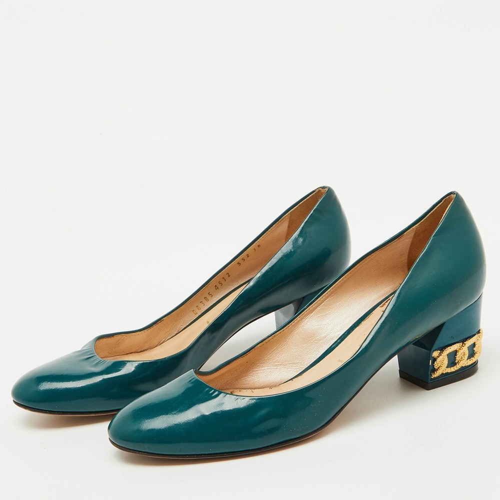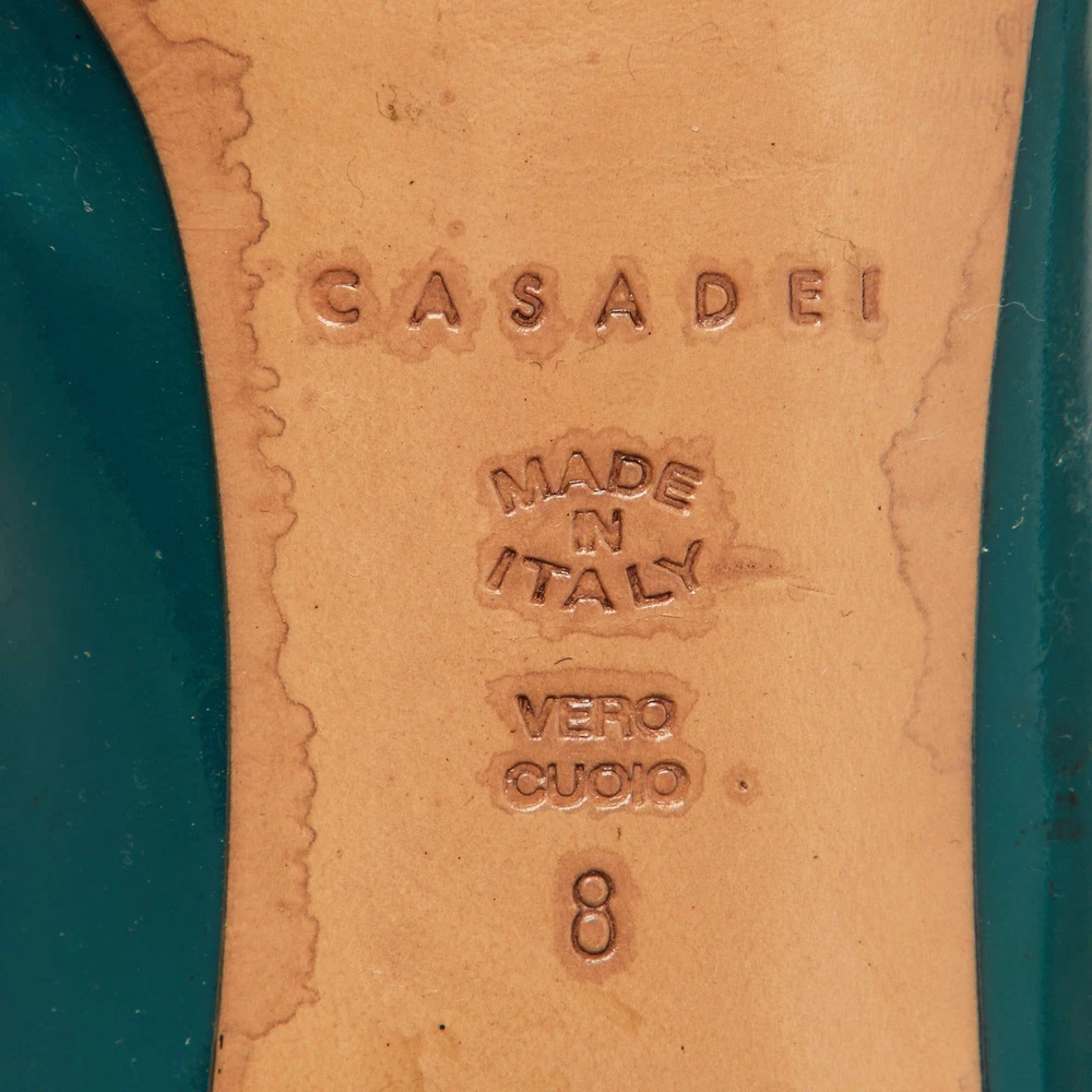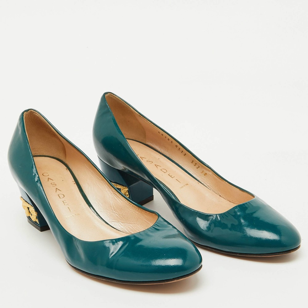Our eBay Store About Us Contact Us Add to Favorite Sellers Casadei Teal Green Patent Leather Chain Block Heel Round Toe Pumps Size 38 These Casadei pumps are a great choice if you’re looking to add a pair that's both classy and bold. The pair has been made in Italy from green patent leather and set on chain-embellished block heels. Product Details Brand Casadei Color Green Includes The Luxury Closet Packaging Outsole Length 25 cm Outsole Width 8 cm Size US 8 (EU 38/UK 5) Certified by The Luxury Closet This item has gone through a detailed authentication process overseen by our experts. We offer a lifetime guarantee of authenticity on all our items. How We Check The in-house team of experts at The Luxury Closet is highly trained to verify the authenticity and the condition of the luxury products. They ensure that only 100% authentic items are put on sale.The evaluation process is unique with its own mix of assessment criteria and differs according to the category. Each item is evaluated based on the following combination of hallmarks, hardware, stitching, symmetry, material, craftsmanship, stamping, codes, hologram stickers, and packaging. Our authenticators also check if the items have been modified or amended (e.g., aftermarket diamonds, replaced batteries, repaired bags, etc.) International Buyers Import duties, taxes and charges are not included in the item price. These charges are the buyers responsibility. Please check with your country’s customs office to determine what these additional cost will be prior to buying.