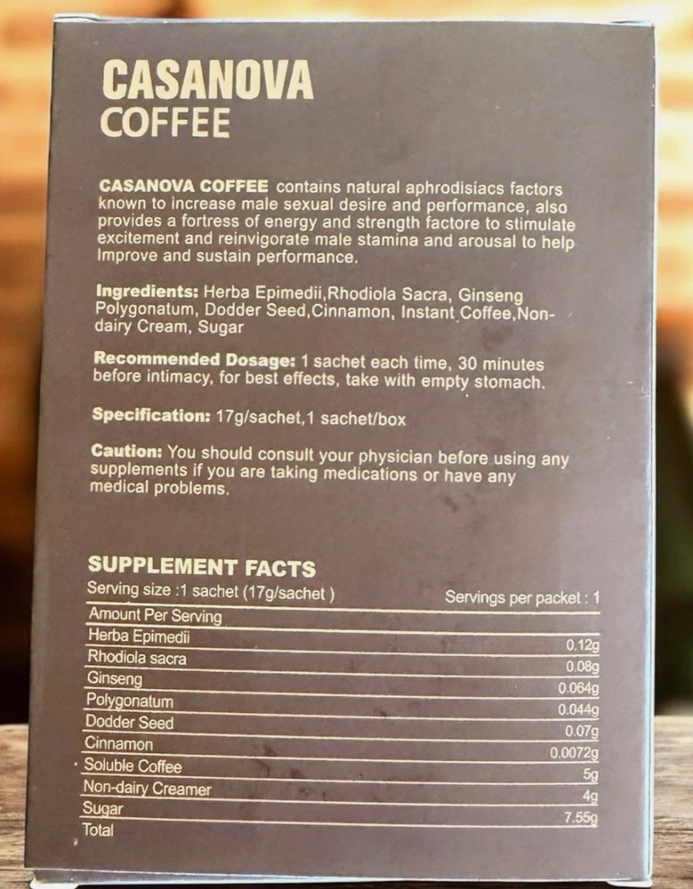 Casanova Coffee™ – Premium Herbal Coffee Blend Experience the rich, smooth taste of Casanova Coffee™, a gourmet coffee blend carefully crafted with natural herbs for a unique, aromatic coffee experience. Perfect for your morning routine or an afternoon pick-me-up. Product Features Premium roasted coffee with a natural herbal blend Single-serve sachets for convenience Smooth, aromatic flavor with no synthetic additives Perfect for home, office, or gifting Ingredients Each sachet contains a carefully selected blend of: Herbal Epimedium Rhodiola Ginseng Dodder Seed Cinnamon Instant Coffee Non-Dairy Creamer Sugar All ingredients are natural and contribute to a flavorful, enjoyable coffee experience. How to Use Add one sachet to hot water Stir well Enjoy hot or cold One sachet per day is recommended as part of your daily coffee routine. Why You’ll Love Casanova Coffee™ Rich, smooth flavor with a natural herbal twist Easy single-serve sachets for daily convenience 100% natural ingredients, no artificial stimulants Ideal for coffee lovers seeking a unique gourmet experience Shipping & Returns Ships securely to ensure freshness Returns accepted within 30 days if unopened ⚠️ Disclaimer Casanova Coffee™ is a gourmet coffee beverage with natural herbs for flavor. This product is not intended to diagnose, treat, cure, or prevent any disease or medical condition. Results may vary, and it should be enjoyed as part of a normal coffee routine. Consult a healthcare professional if you have any health concerns or questions about ingredients.