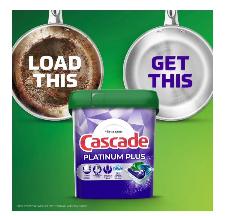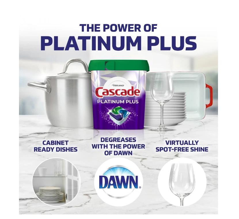 About this item Our best dishwasher detergent for cabinet ready dishes Only Cascade Platinum Plus contains 2X* the Dawn grease fighting power and 2X* the scrubbing power to power through dried on food *Cleaning ingredients vs Cascade Complete ActionPacs Get virtually spotfree sparkling clean dishes on even the toughest messes 40% larger liquid top for even more* cleaning power that still fits in your dishwasher detergent dispenser *vs Cascade Platinum ActionPacs Running the dishwasher daily saves water* Save up to 20 gallons of water per dishwasher load when you skip the pre-wash *ENERGY STAR certified dishwashers use 4 gallons per cycle. Running the tap for 11 minutes handwashing uses up to 24 gallons of water. #1 Recommended Brand in North America* *More dishwasher brands in North America recommend Cascade based on co-marketing agreements vs. other automatic dishwasher detergent brands Formulated to help prevent hard water spots and filming to keep your machine looking fresh and clean Lemon, 62 Count